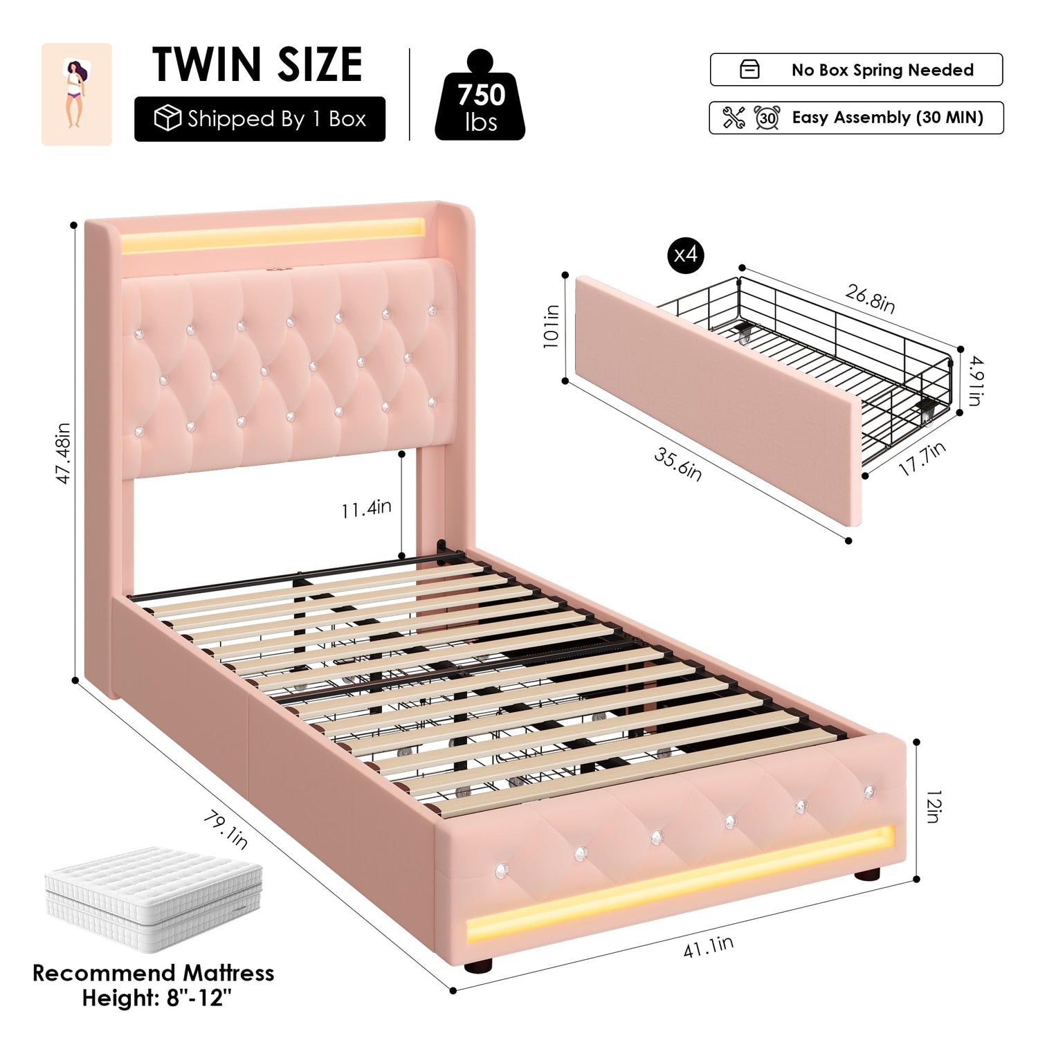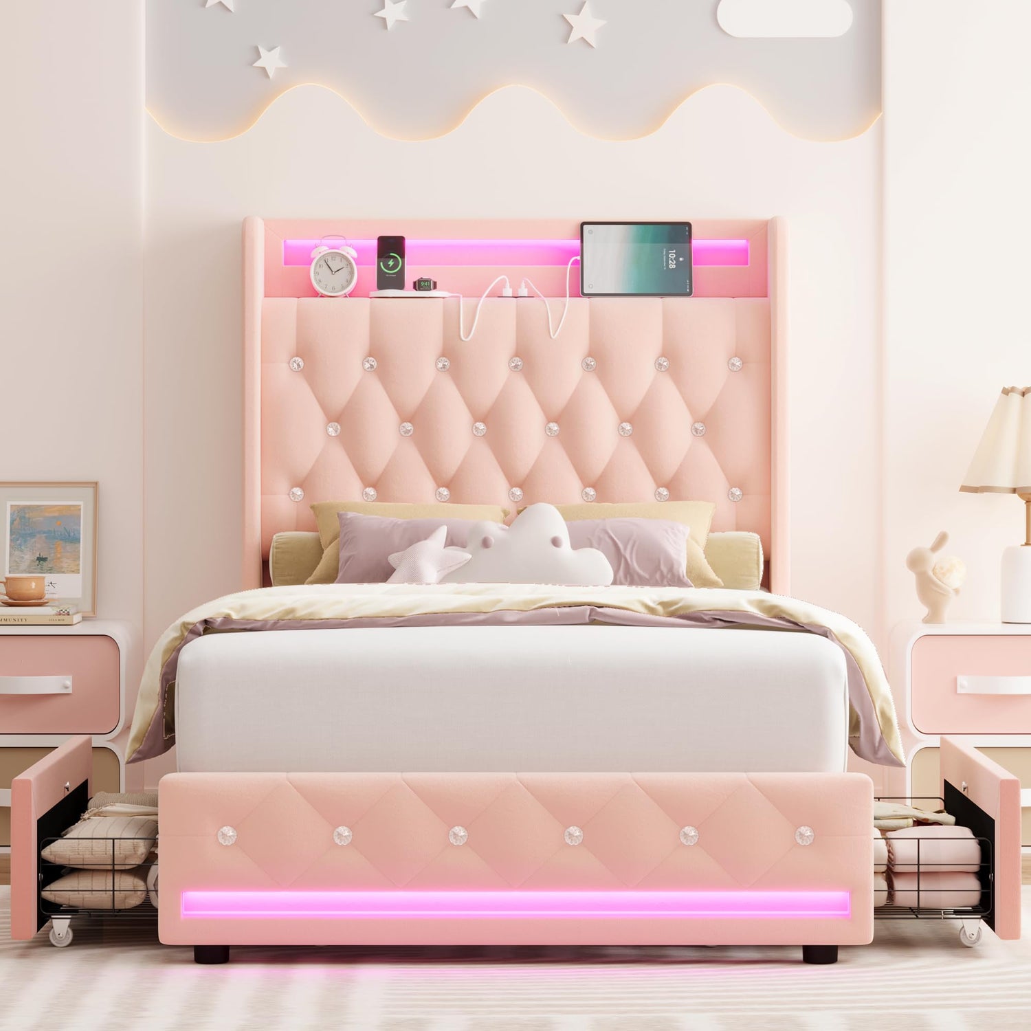 - IDEAL BED CHOICE FOR EVERY GIRL'S BEDROOM: We believe that every girl deserves a magical and cozy bed where she can feels safe, relaxed, and inspired. The HIFIT LED bed frame with storage, featuring a crystal tufted wingback headboard, is the perfect choice. The sparkling crystal button headboard is adorned with colorful LED light that are customizable in colors and modes for a personalized bedroom ambiance. Plus, with its versatile storage design and built-in charging station, this twin size bed frames combines practicality with convenience, making it an ideal choice for a chic girls bedroom or guest room