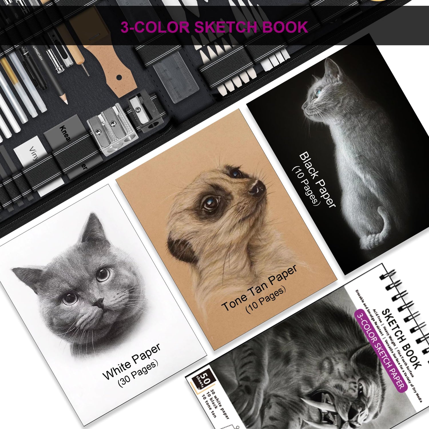 - 【Unique 3-Color Sketchbook】6 x 9", 100GSM, 50 Pages (30 pages white, 10 pages toned tan, 10 pages black) - Different colors of sketch paper are suitable for different styles of drawing, one sketchbook can meet your needs for different colors of sketch paper, no need to spend more money to buy different colors of sketchbooks.