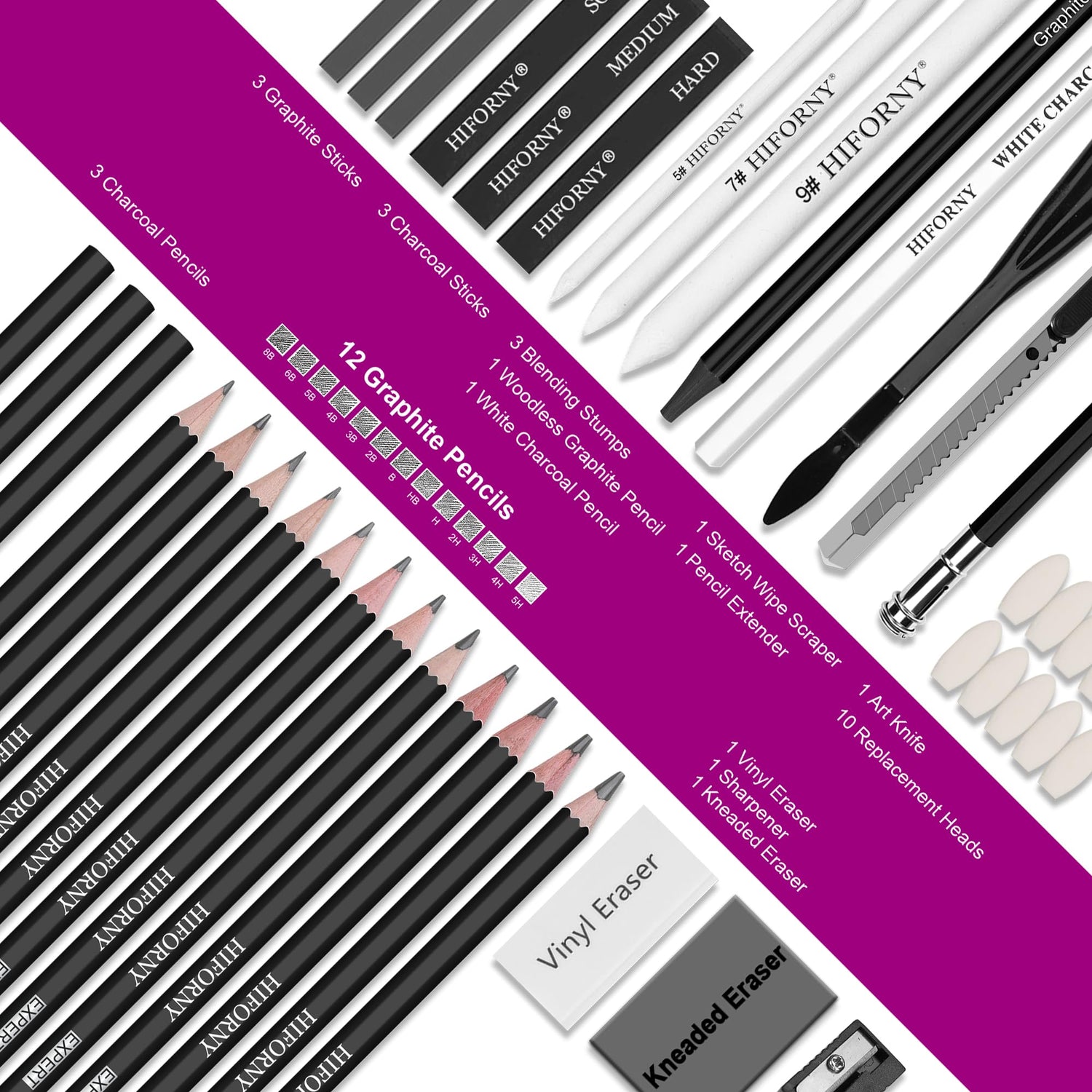 - Complete Drawing Pencil Set: HIFORNY 42 PCS sketching and drawing kit includes 12 premium graphite pencils (8B, 6B, 5B, 4B, 3B, 2B, B, HB, 2H, 3H, 4H, 5H), 3 black charcoal pencils (Soft, Medium, Hard), 1 white charcoal pencil (Medium), 1 woodless graphite pencil (6B), plus 3 graphite and 3 charcoal sticks (Soft, Medium, Hard). Each pencil is clearly labeled for easy selection—perfect for sketching, shading, blending, and layering.