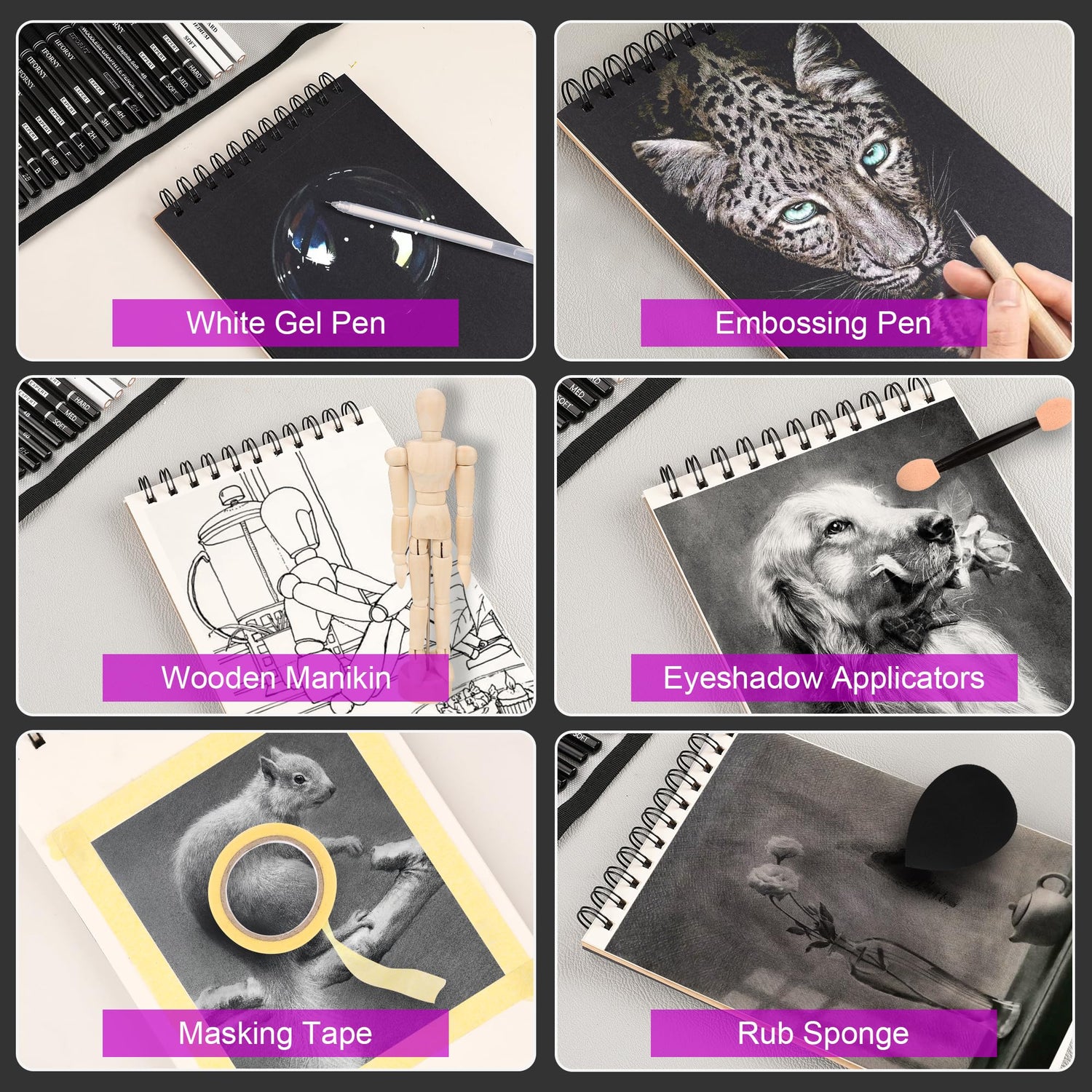 - 【Extra Drawing Sketching Supplies Kit 】This sketching set includes almost all the accessories for sketching and drawing,includes 3 blending stumps,6 eyeshadow applicators,1 kneaded and 1 vinyl eraser,1 rub sponge,1 sandpaper block,2 sharpeners,1 pencil extender,1 art knife,1 drawing mannequin,1 masking tape,1 plastic ruler.These extras are essential for artists and beginners.