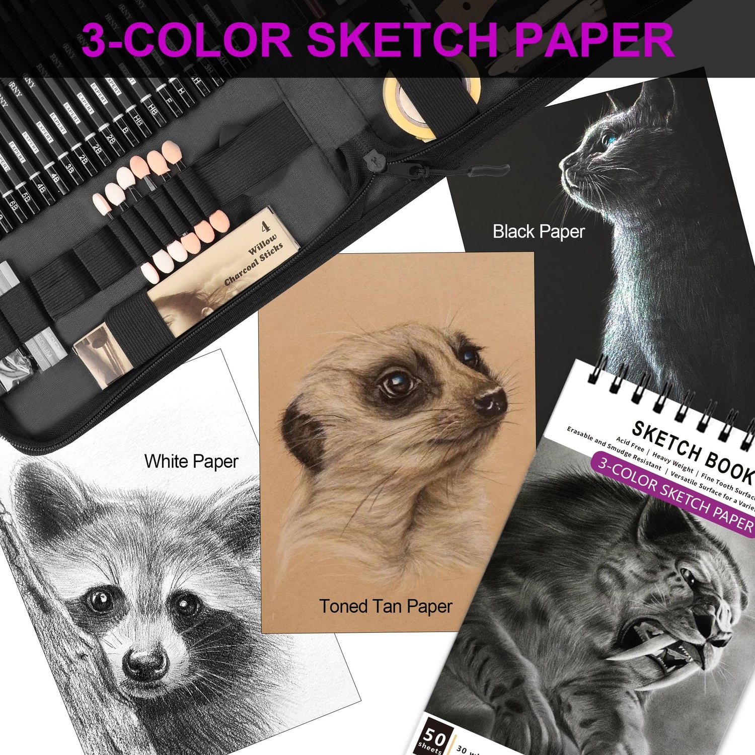 - 【Unique 3-Color Sketchbook】6 x 9", 100GSM, 50 Pages (30 pages white, 10 pages toned tan, 10 pages black) - Different colors of sketch paper are suitable for different styles of drawing, one sketchbook can meet your needs for different colors of sketch paper, no need to spend more money to buy different colors of sketchbooks.