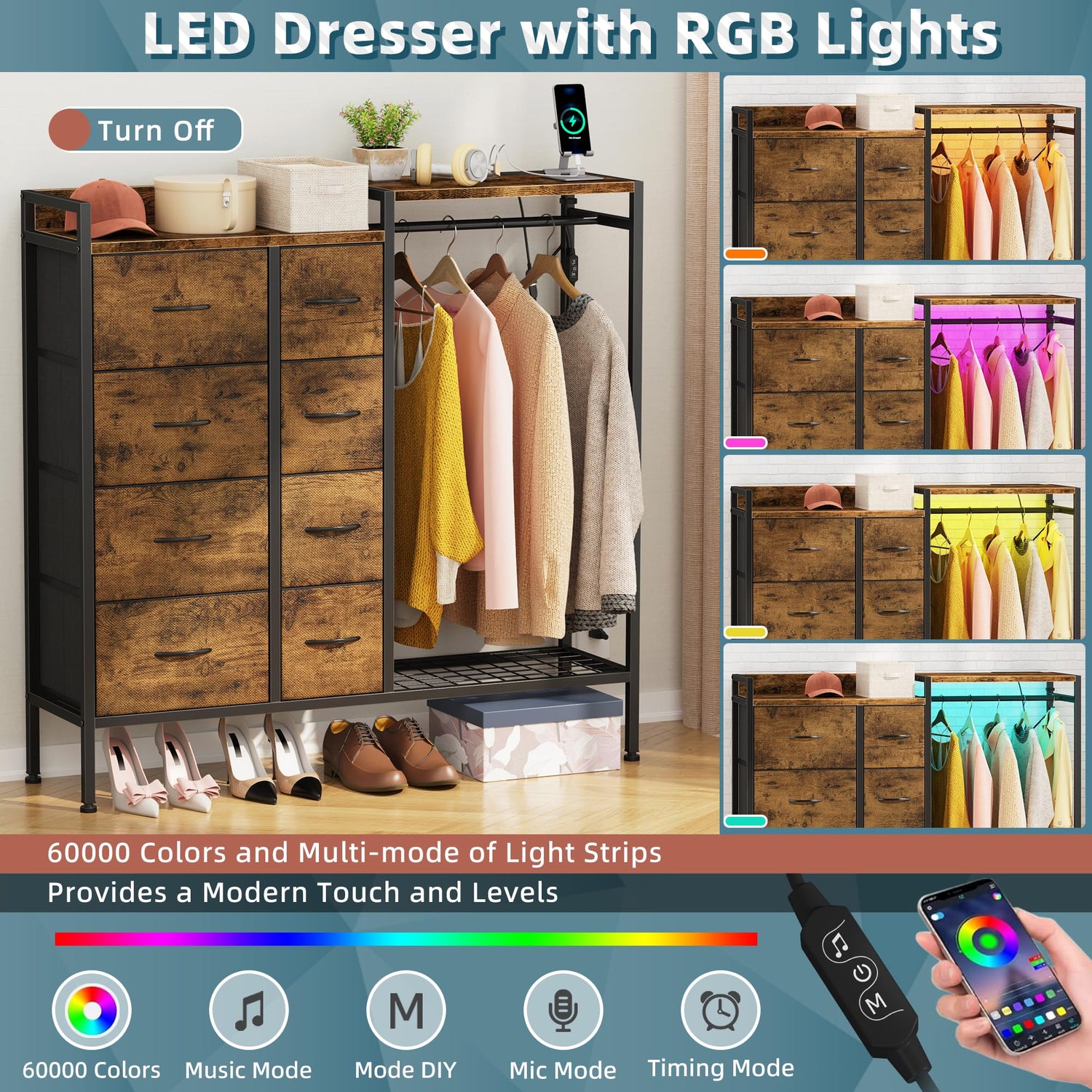 - Soft RGB Lighting That Actually Helps: The integrated RGB LED light strip provides gentle lighting for nighttime use—perfect for kids’ rooms, shared bedrooms, or late-night outfit changes without harsh overhead lighting