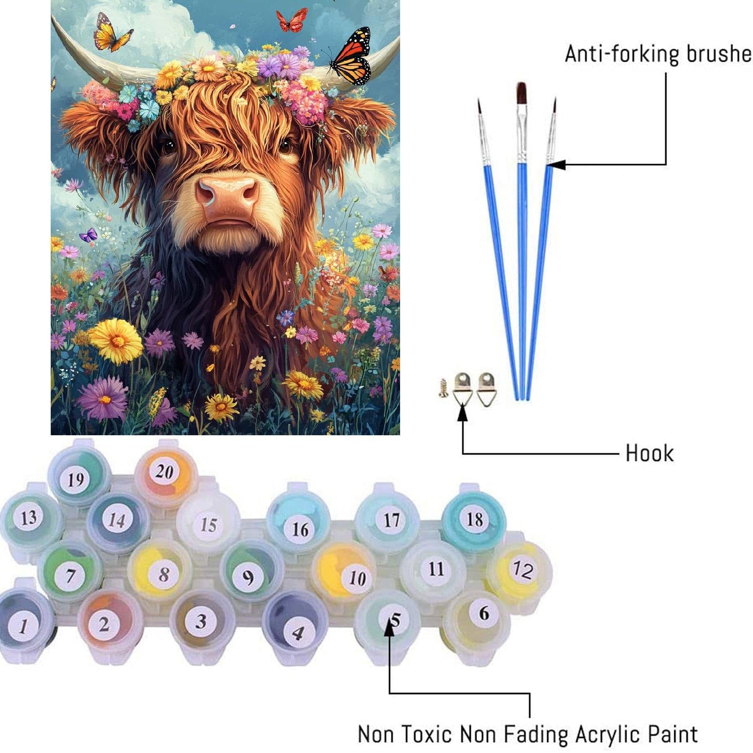 - 【Adults' Paint-by-Number Kits-Highland Cow in Spring 】Painting by numbers kits include paint by number canvas, size 16x20 inches (no border),1 set acrylic paints,1 set paint by numbers brushes(include 3pcs).and number painting for adults accessories,hook and number drawing paper guide.