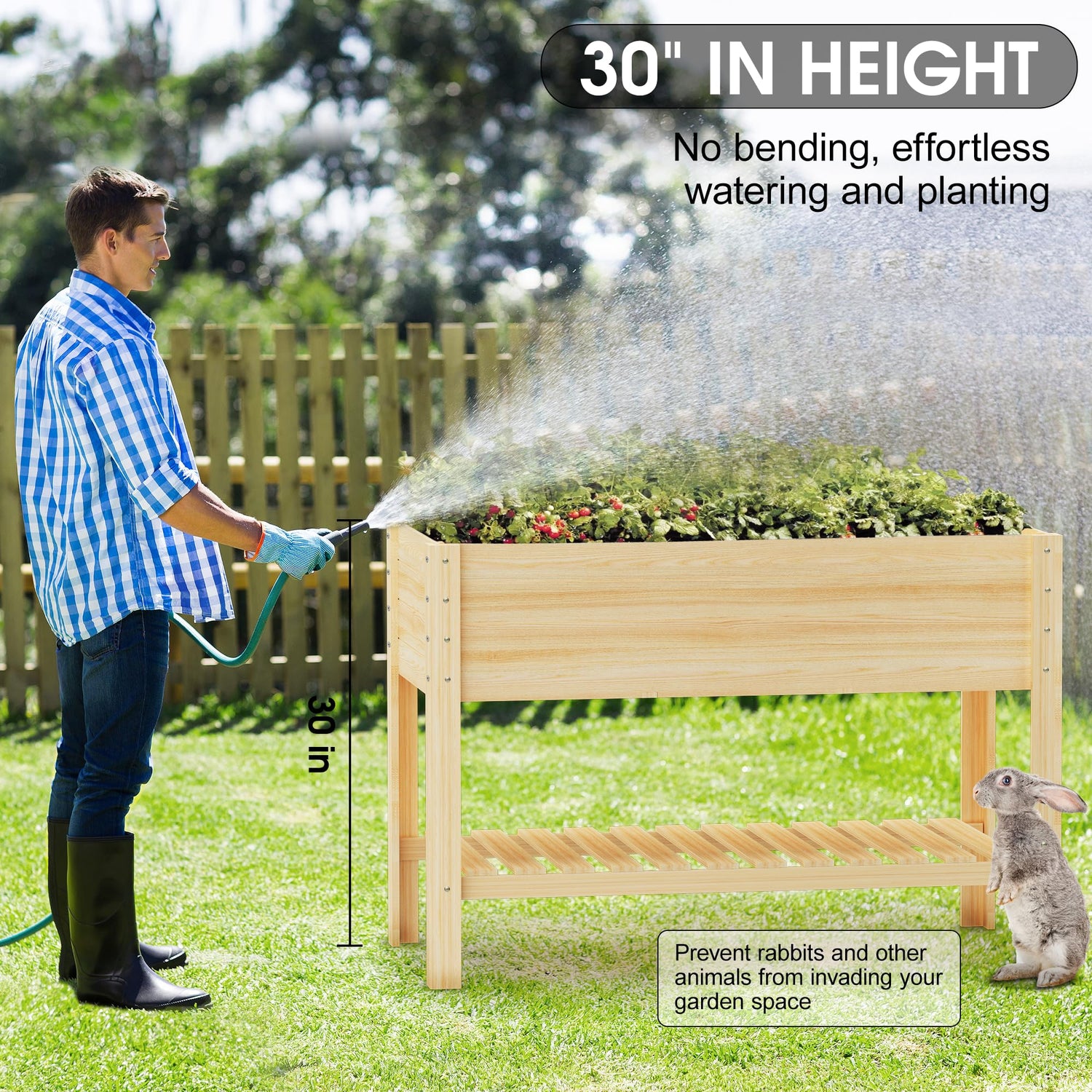- Raised Planter Box with Shelf Storage: A storage shelf is added at the bottom of the wood raised garden bed, which provides spacious space for storing extra soils , small flower pots, gardening tools, it makes all these things within arm’s reach. The shelf can also increase the stability of the planter