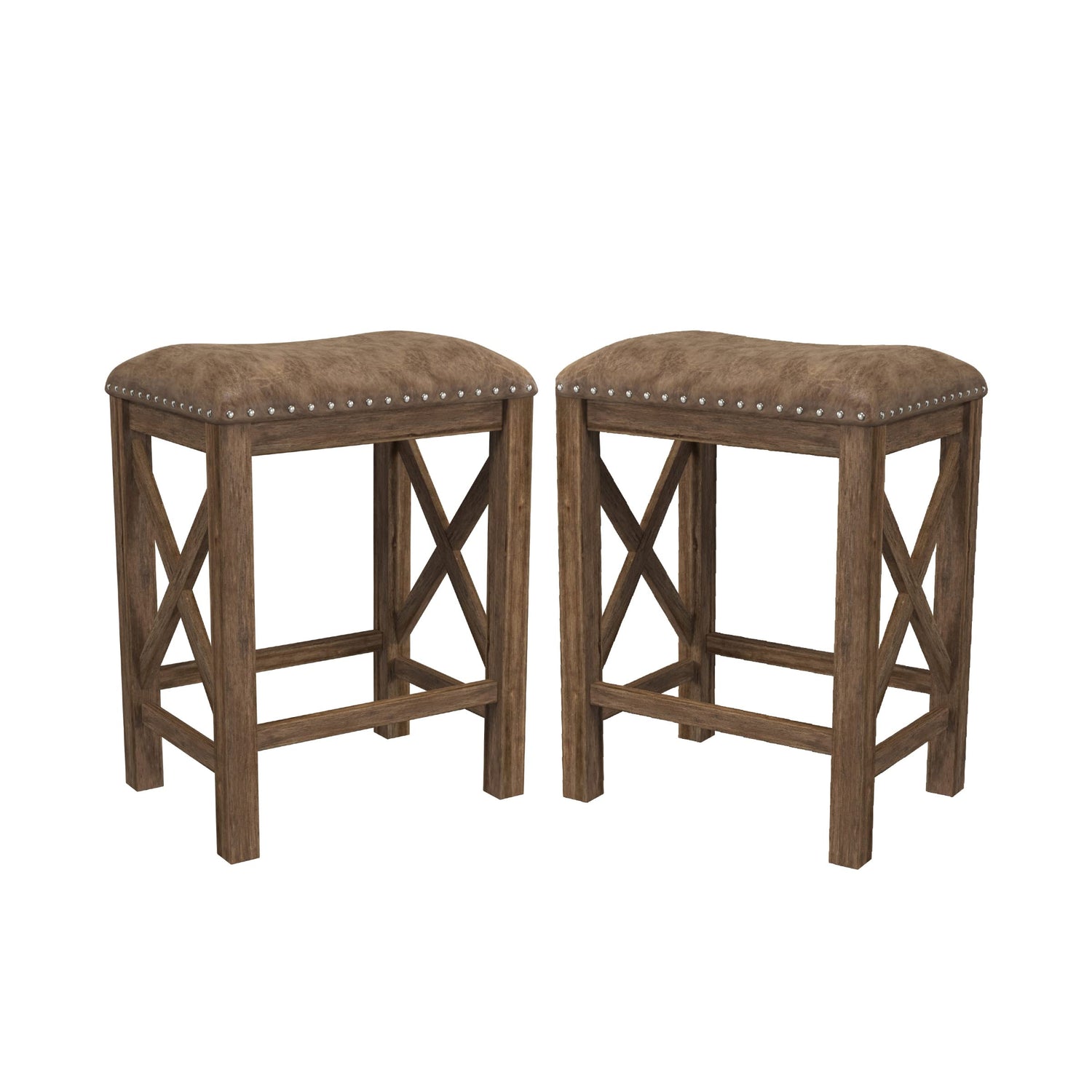 Details: No one likes to eat, drink, and be merry alone. And with this set of two backless Counter Height Stools, you'll always have an extra seat for company. Crafted from solid wood in a rustic antique walnut finish, the sides of these stationary stools have an X-design that adds visual appeal while providing reinforcement. And with plush seats covered in weathered brown faux leather and brass nail head trim, the rustic stool set gets an added touch of farmhouse flair to give them that best-of-both-worlds quality. Assembly required.