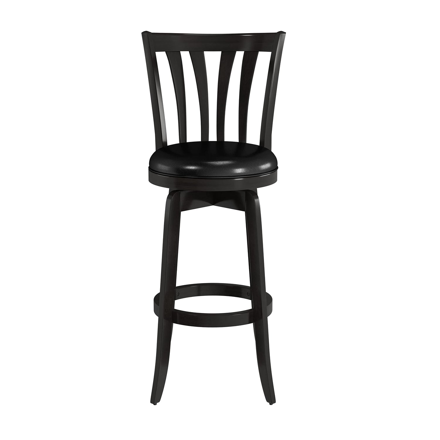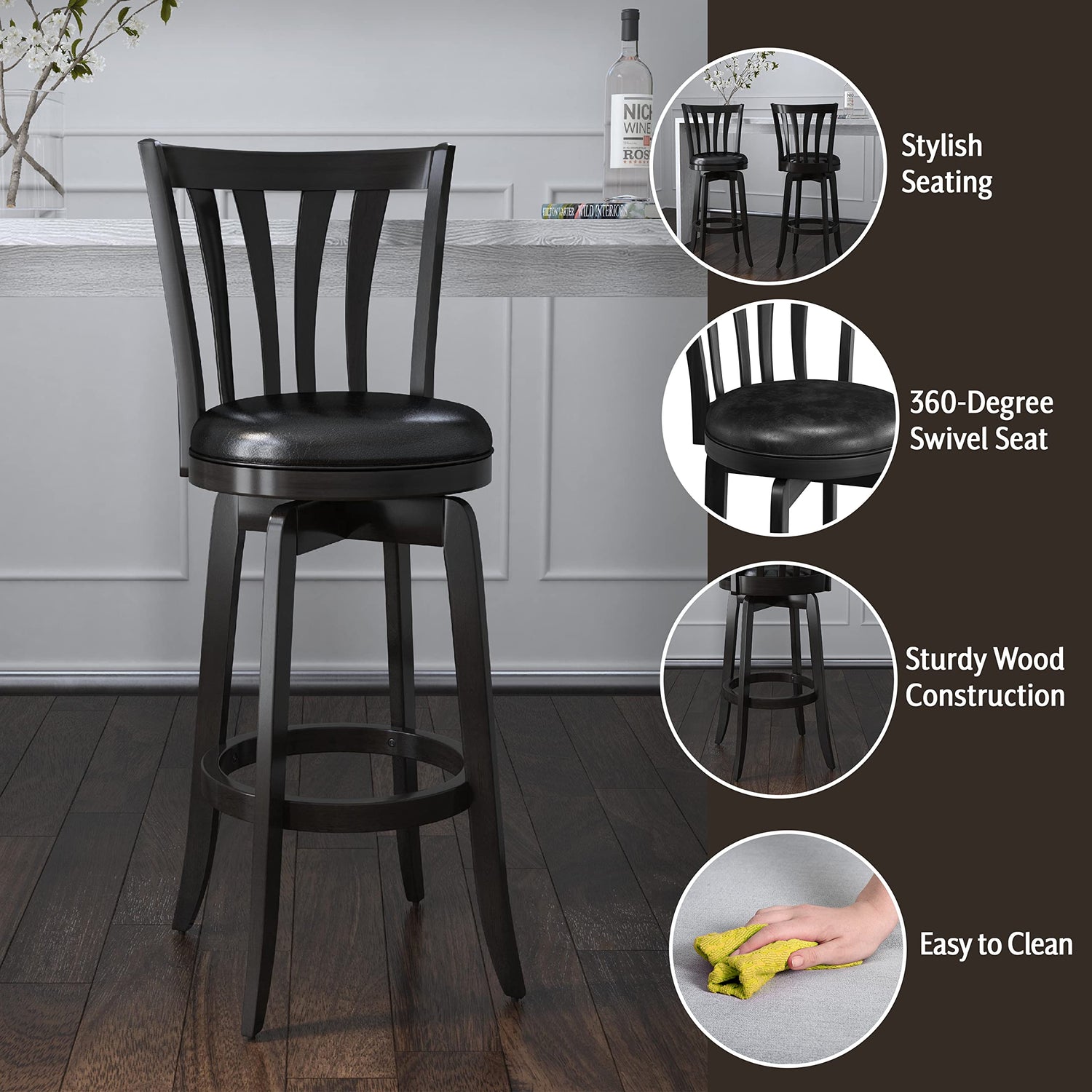 Details: If familiar and inviting decor are hallmarks of your interior style, you need pieces that have a story. With this transitional-style Bar Stool, get the charm of vintage paired with new construction. Crafted with a clean-lined frame styled with a black finish that looks like naturally aged wood, and a black upholstery that offers texture and durability, this 360-degree swivel bar stool with its high, flared back will be the perfect spot to create memories and share traditions for years to come. Assembly required.