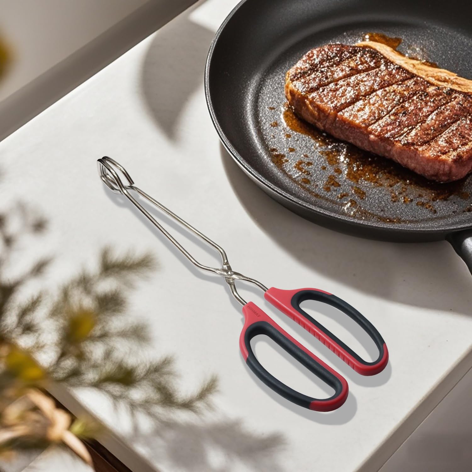 - COMFORTABLE GRIP, EASY ON YOUR HANDS - The old version of the scissor tongs handles are too small, not large enough to comfortably hold. We released a high-quality scissor tong which completely different with competitors. A silicone lined handle makes holding items with it a more pleasant experience.