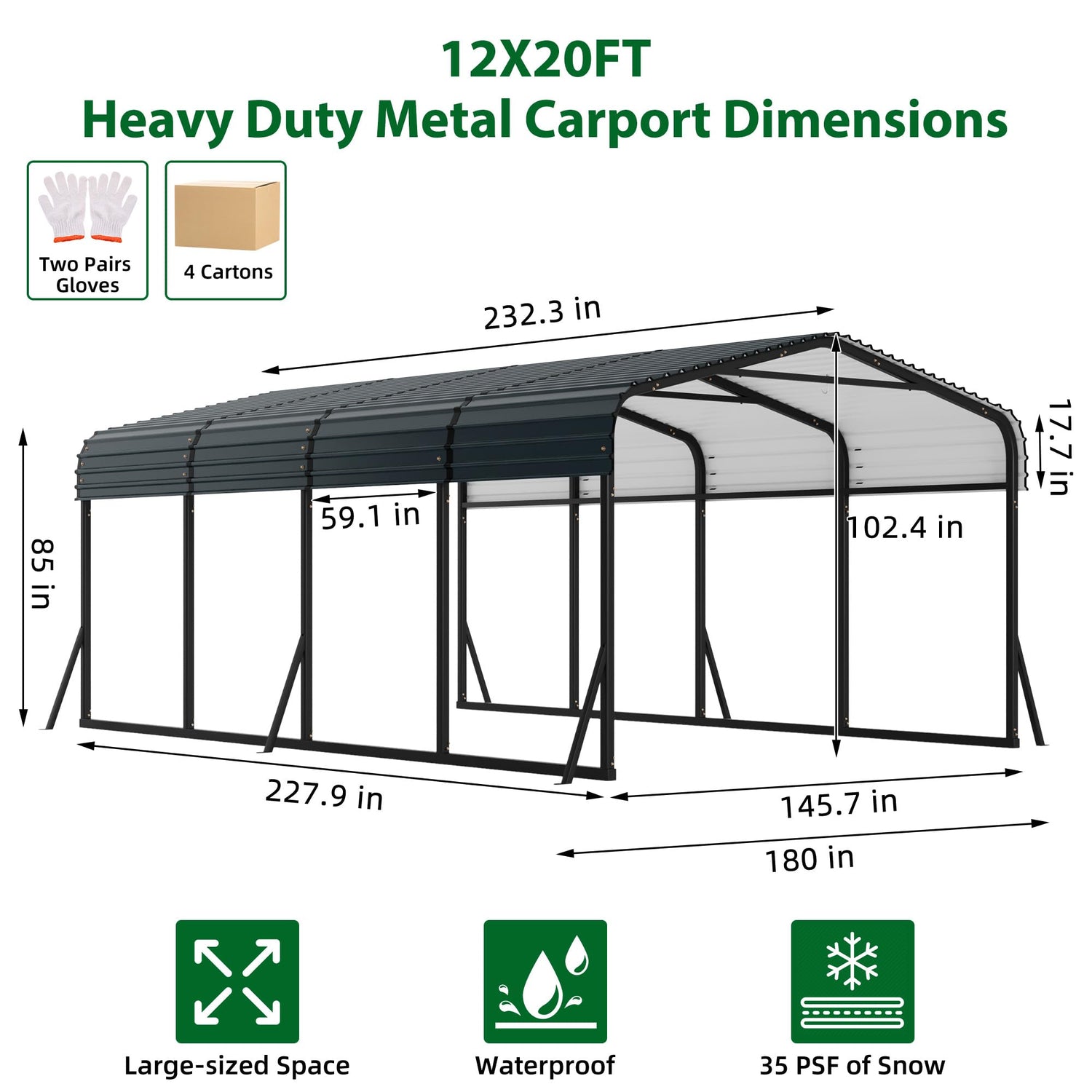 - DIMENSIONS - The outer dimensions of the heavy duty outdoor metal carport canopy are: 12 feet wide, 20 feet deep, and 8.5 feet high. The inner measurements of the outdoor large metal carport canopy are: 145.7'' wide, 232'' deep, and 102.4'' high. The eave height is 85 inches, and the maximum entrance height is 102.4 inches. Please note that the product will be divided into 4 packages, which may not arrive at the same time. Following the instructions makes the garage assembly easier