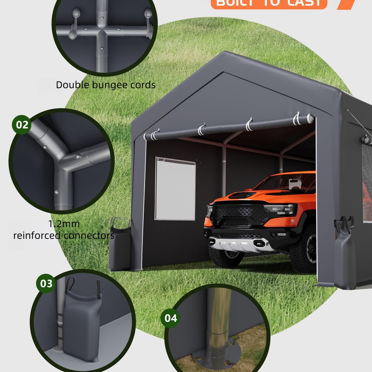 - 【8-Foot Heavy-Duty Metal Frame】 - This portable garage carport features a galvanized steel frame with 1.5-inch diameter poles, 0.88 thick millimeters, and 1.65-inch diameter connectors, along with 4 sturdy wind ropes,16 large steel stakes, and 8 spiral anchors, making the entire steel garage safer and more stable.