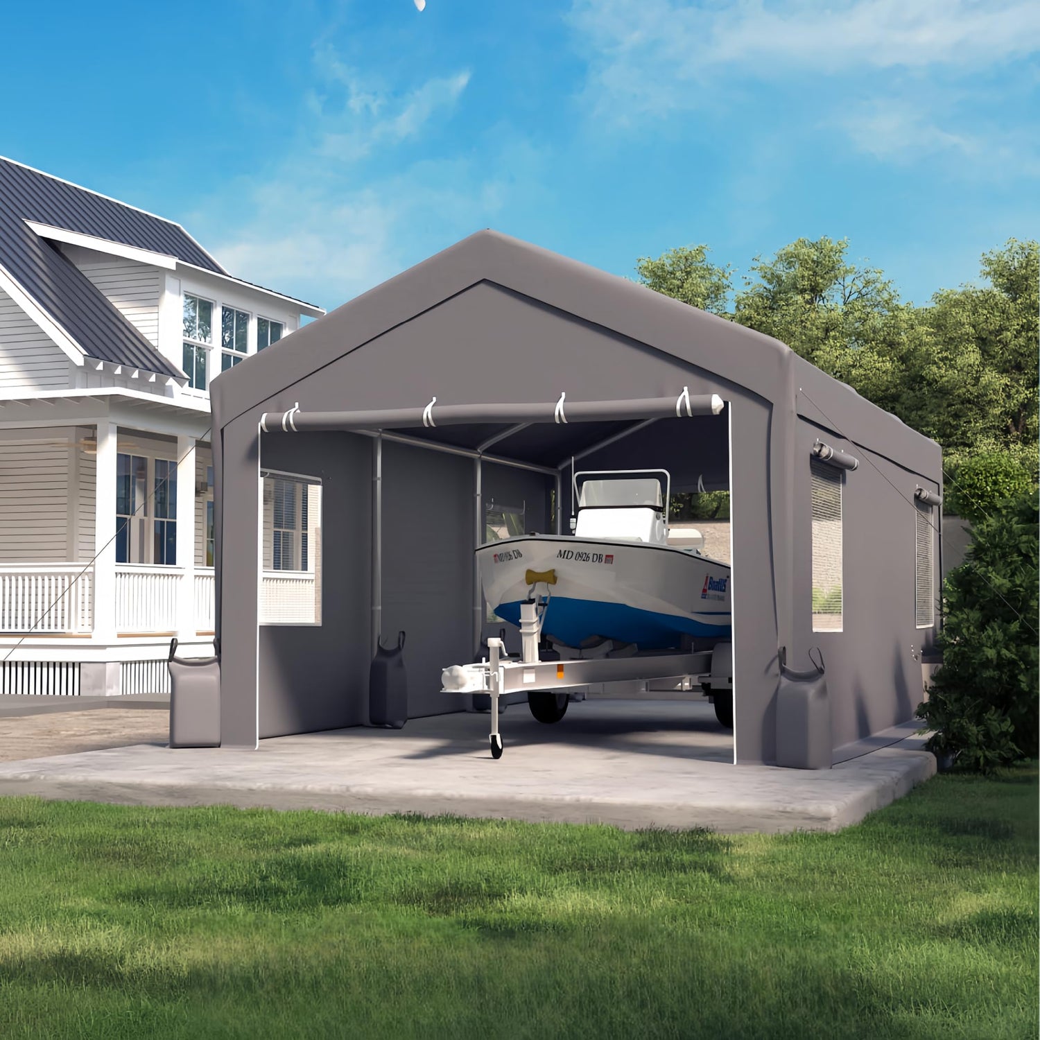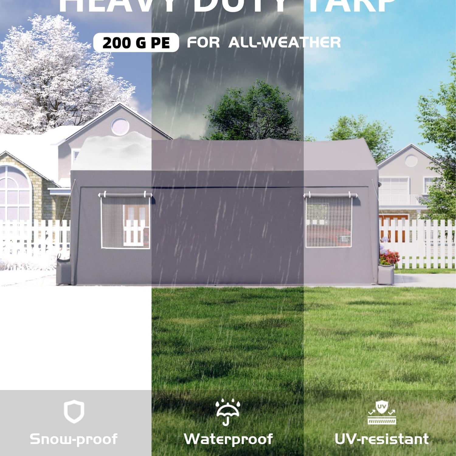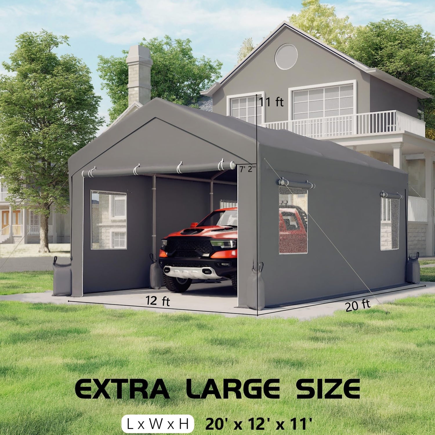 Hipicute 12'x20'x11' Heavy-Duty Portable Garage with Canopy Top, Front and Back Doors, Roll-Up Windows, Carport Shelter Reinforced Structure for Cars, Trucks, Boats, and Parties - Gray