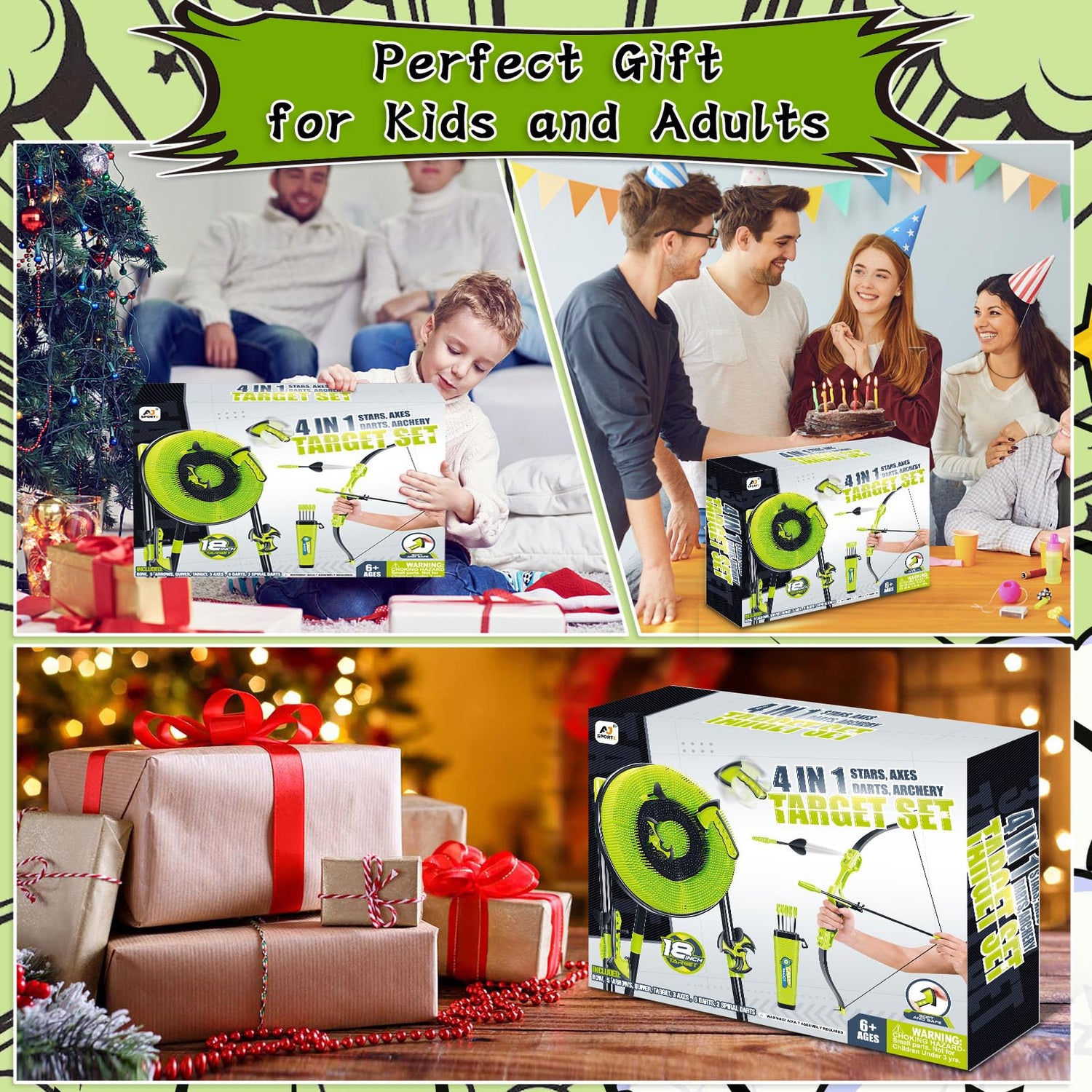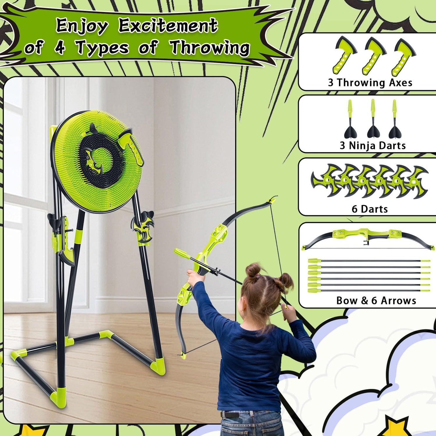 - 4-in-1 Axe Throwing Game Set: The plastic axe throwing set releases the excitement of 4 kinds of throwing, including a bristle target, 3 throwing axes, 3 ninja darts, 6 darts, and a bow and 6 arrows. Aim these at the target, which will be a very exciting game