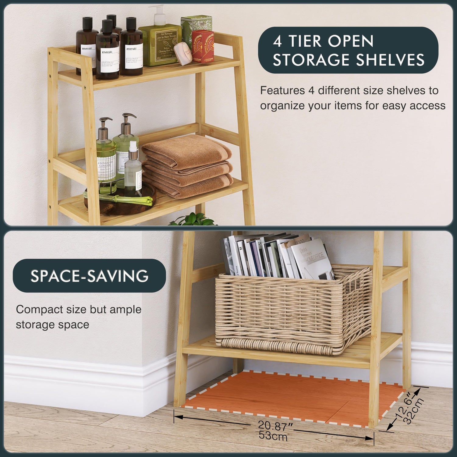 Experience ample extended storage space with four open boards that deepen from top to bottom, allowing you to organise daily items of various sizes with ease. The top tier is perfect for showcasing picture frames and artwork, while the middle levels accommodate your favourite books, plants, and collectibles. The spacious lower shelf is ideal for storage baskets and boxes, ensuring that all your essentials are both neatly organised and easily accessible.