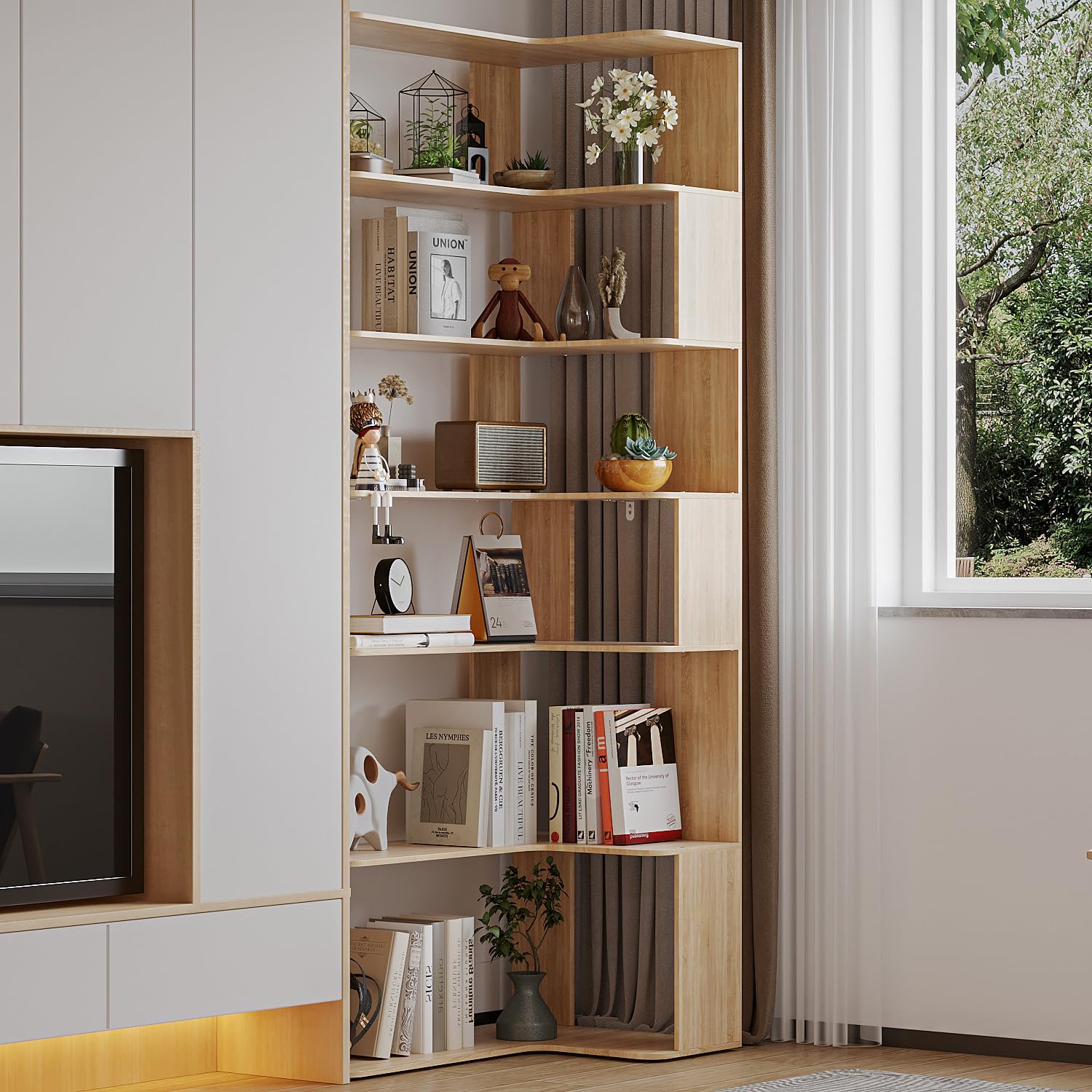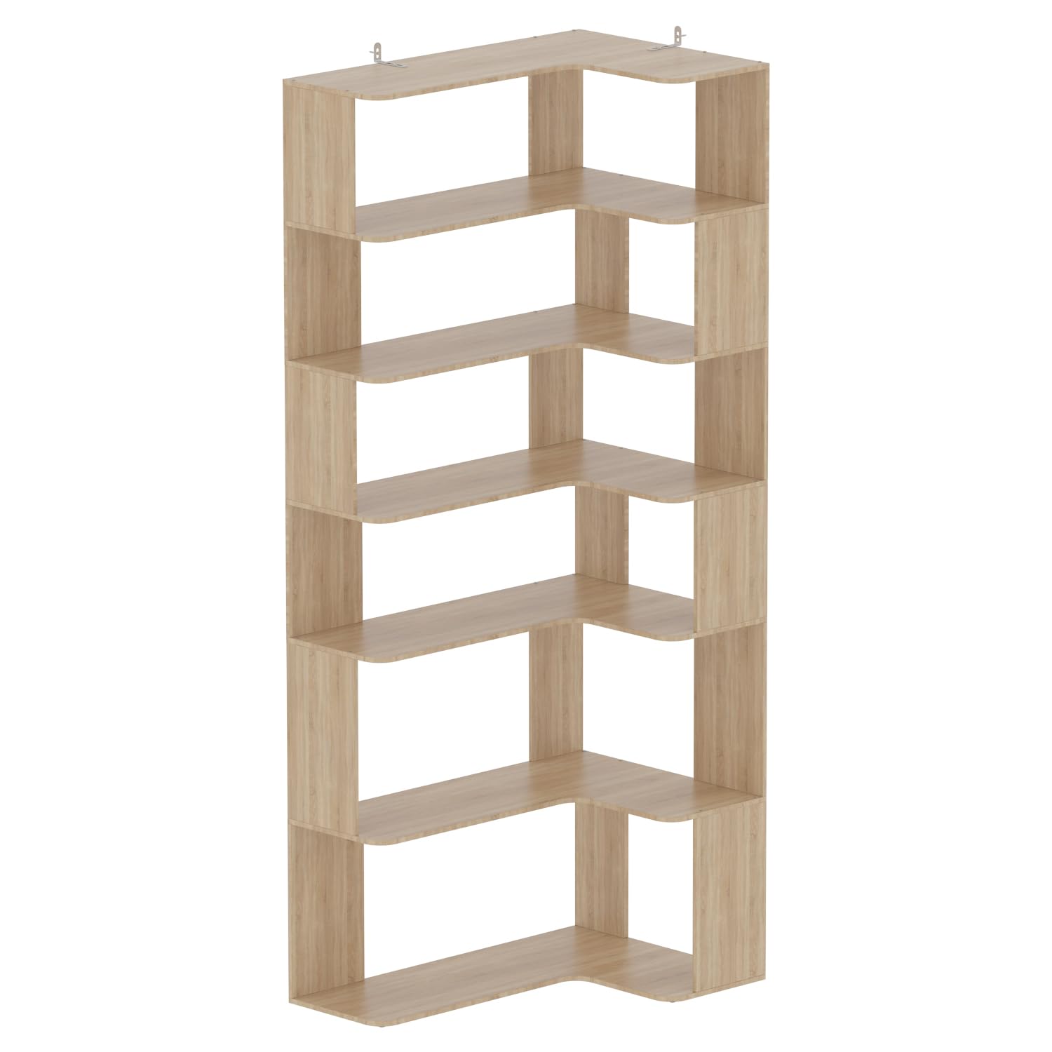 Hitow 6-Tier Wooden Bookcase, L Shaped Geometric Bookshelf, 81.9" H Freestanding Storage Shelf Room Divider, Open Corner Shelf Storage Unit for Living Room Home Office, Beige (35.4" W x 23.6" D)