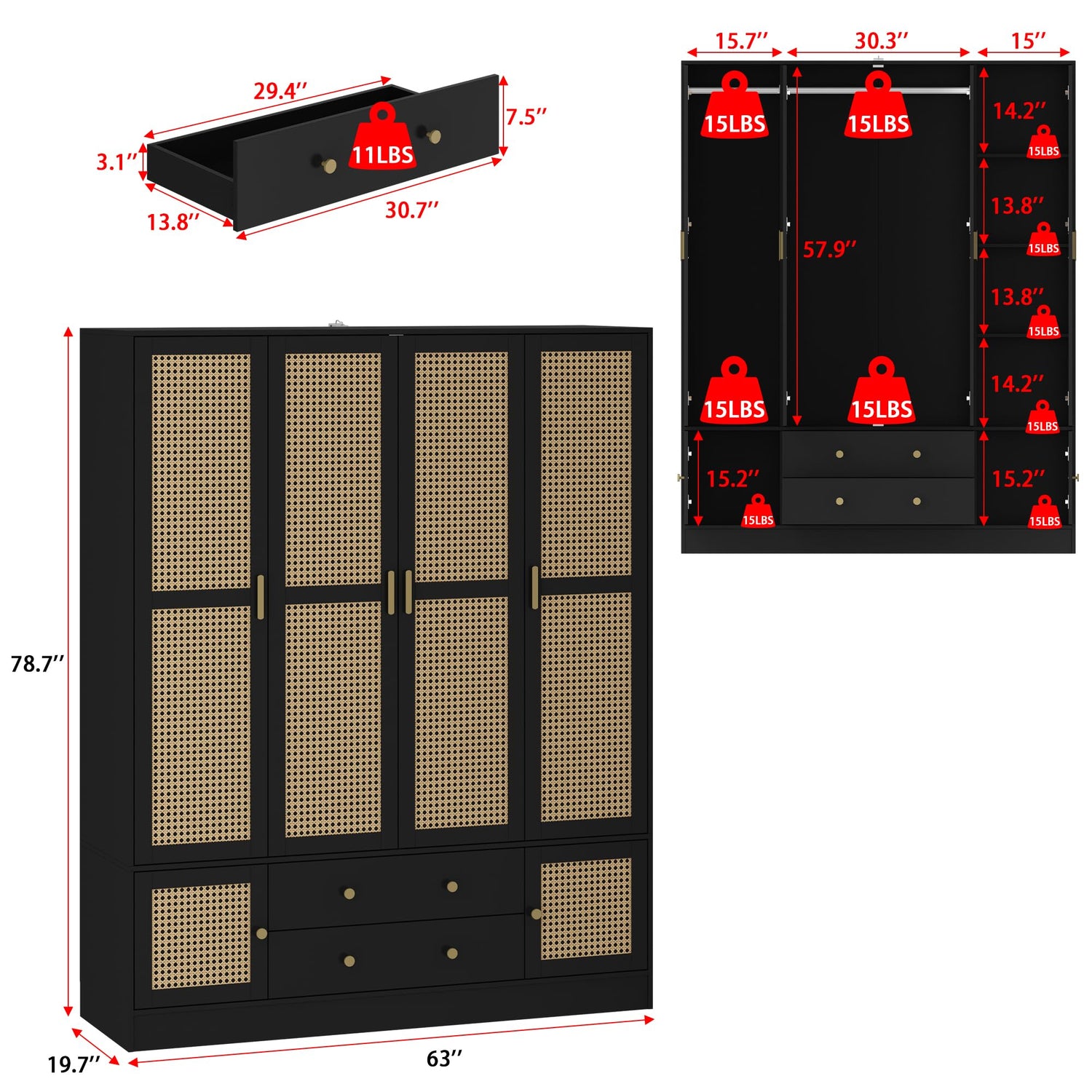 Hitow Rattan Large Wardrobe Closet with 2 Drawers and Doors, Hobo Wooden Cabinets for Clothes with 8 Shelves and 2 Hanging Rods, Wooden Wardrobe Closet for Bedroom, Black, 19.6" D x 63" W x 78.7" H