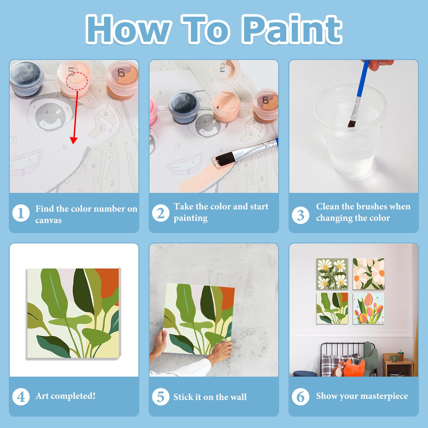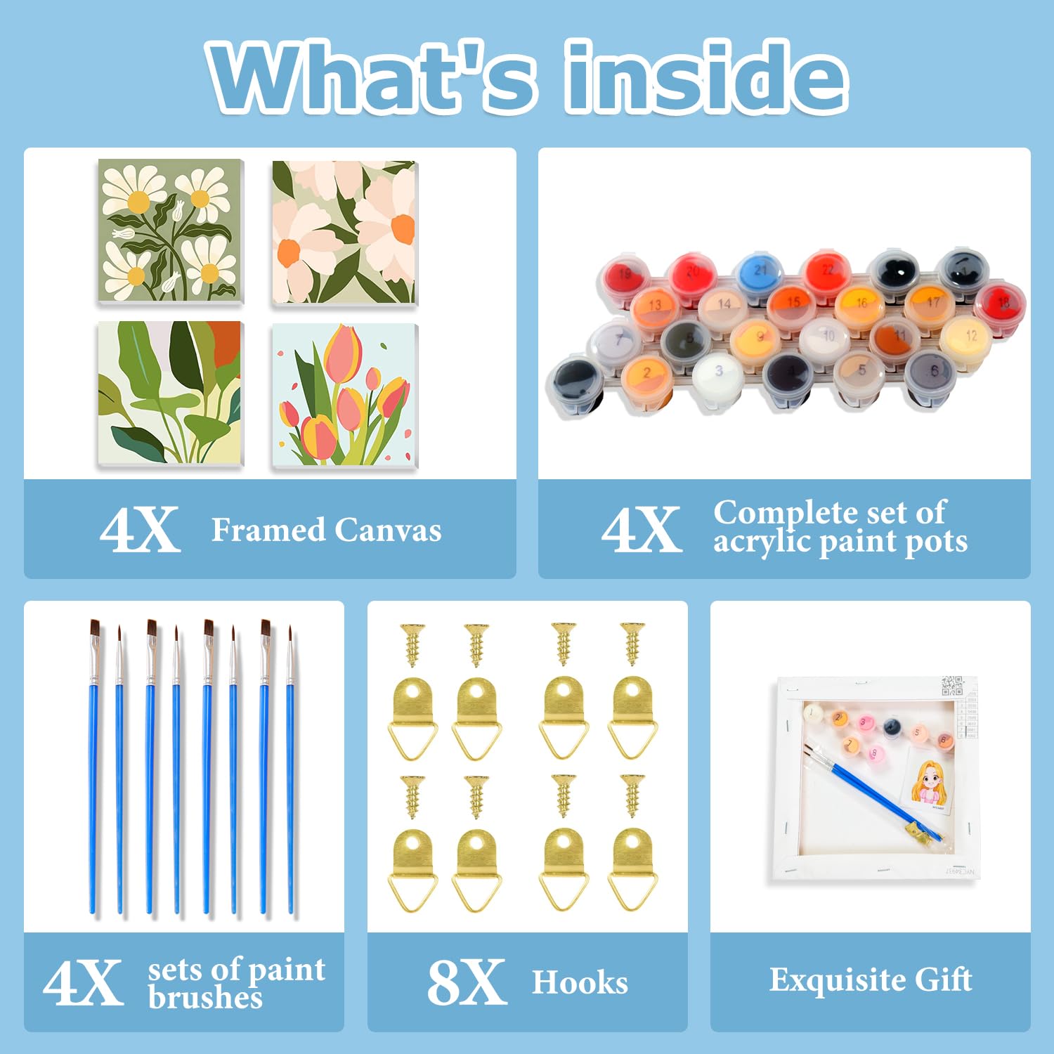 - What You Will Receive:With the purchase of 4 Pack Paint by Number Kits you will get:4 pre-printed textured art canvas(Canvas Framed),4 set of acrylic paints,4 set of paint by number brushes,4 set of hooks.You only need to color according to the numbers to complete beautiful oil paintings.