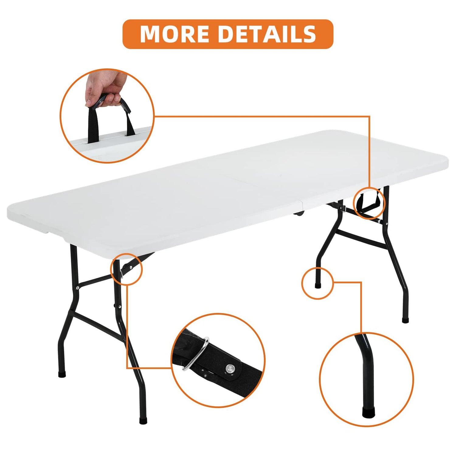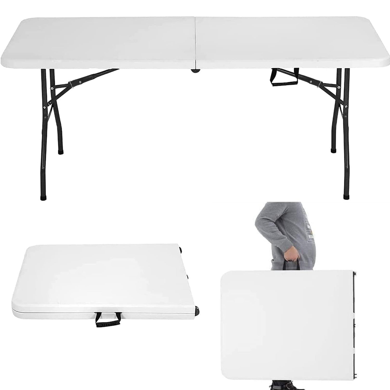 - 【FOLDING & PORTABLE】 No assembly required. This 6 foot folding table folds in the center, locks closed, and is compact and easy to store. Comes with a comfortable carry handle for better portability.You can put the folding table in the trunk, and then go on a picnic trip with your friends.Plan for your next social gathering with this 6-foot plastic folding table.