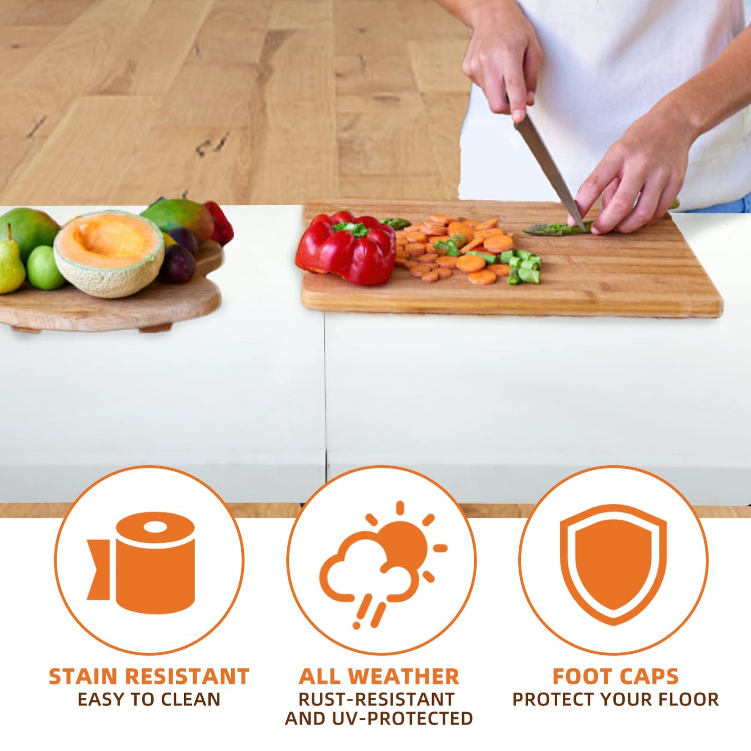 - 【RUGGED & STURDY】 Made of heavy duty blow molded High Density Polyethylene (HDPE), 20% thicker and stronger than those fragile hollow tables. The surface is waterproof, scratch and impact resistant.The folding table with Powder-coated steel legs, the camping table frame joint locks, and non-slip rubber feet help to keep the plastic table in place during every event.