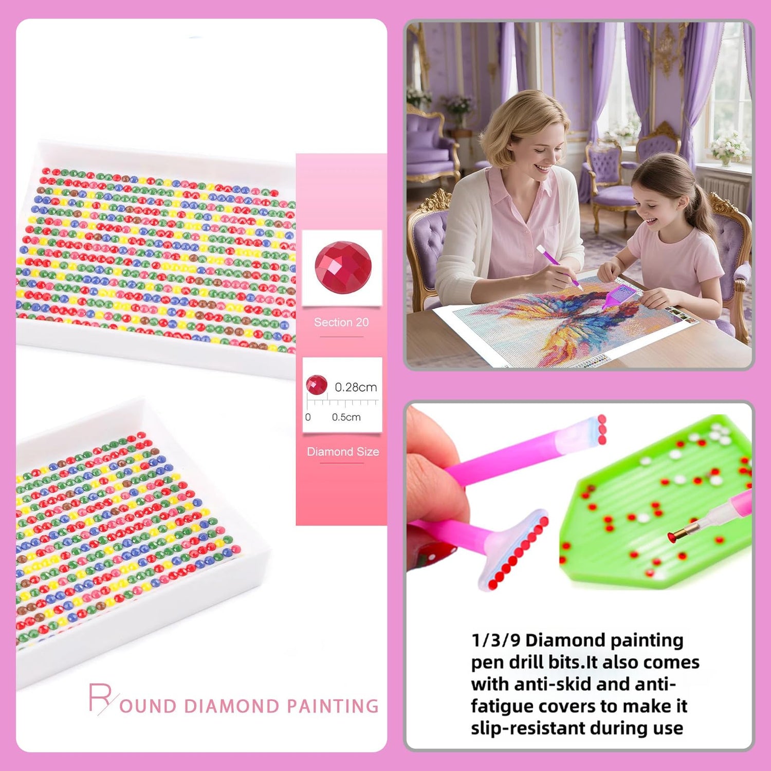 - Diamond Art Kits: Including 1×high definition painting canvas; color coded rhinestones; 1/3/9×point diamond pen drill bits; 1×craft tray; 1×clay; 4×self-sealing bags.