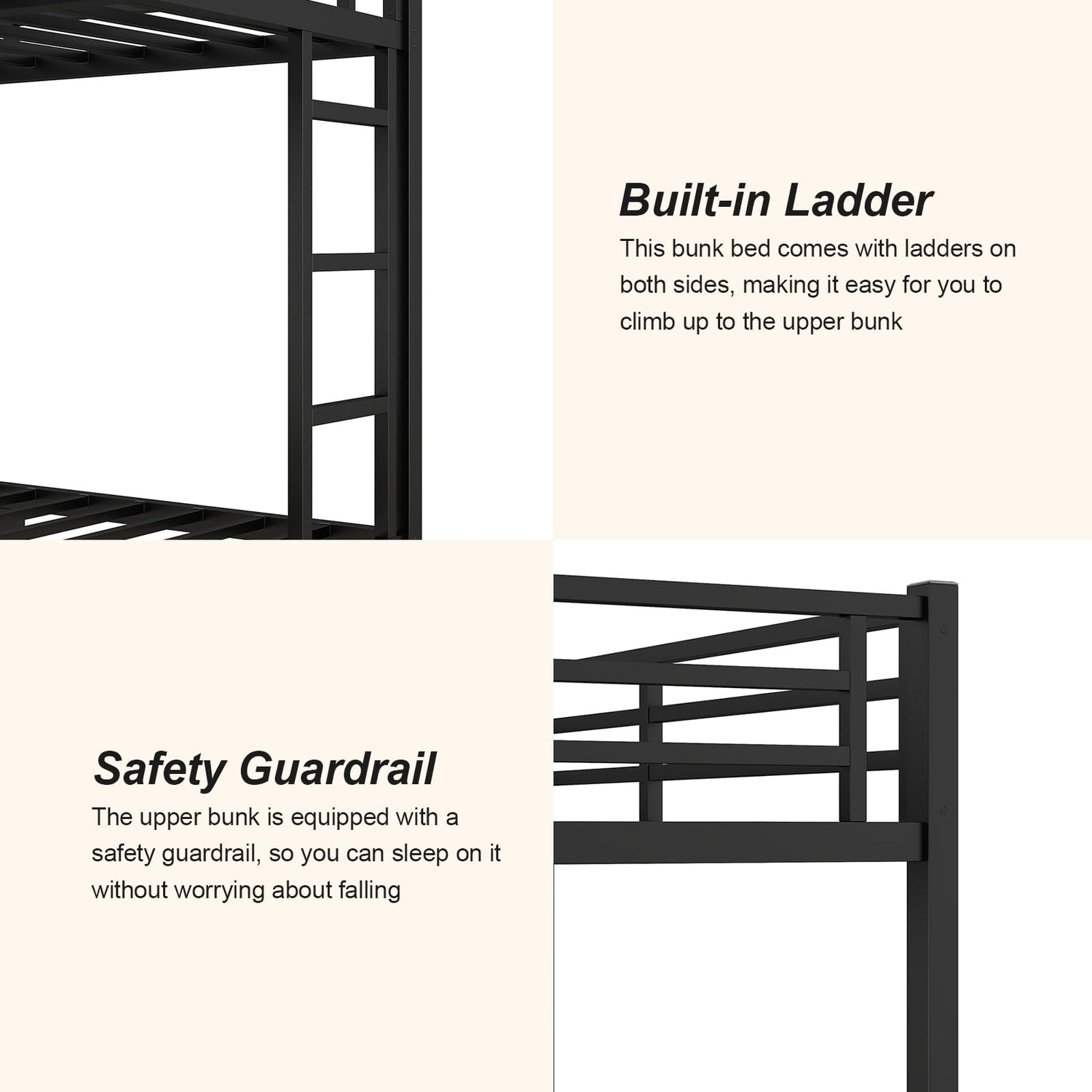 HKOLIE Queen Over Queen Bunk Bed, Metal Bunk Bed Frame Heavy Duty Bunk Beds Loft Bed Frame with Ladder and Guardrail Metal Slats No Box Spring Required for Adults Teens, Queen Over Queen Size