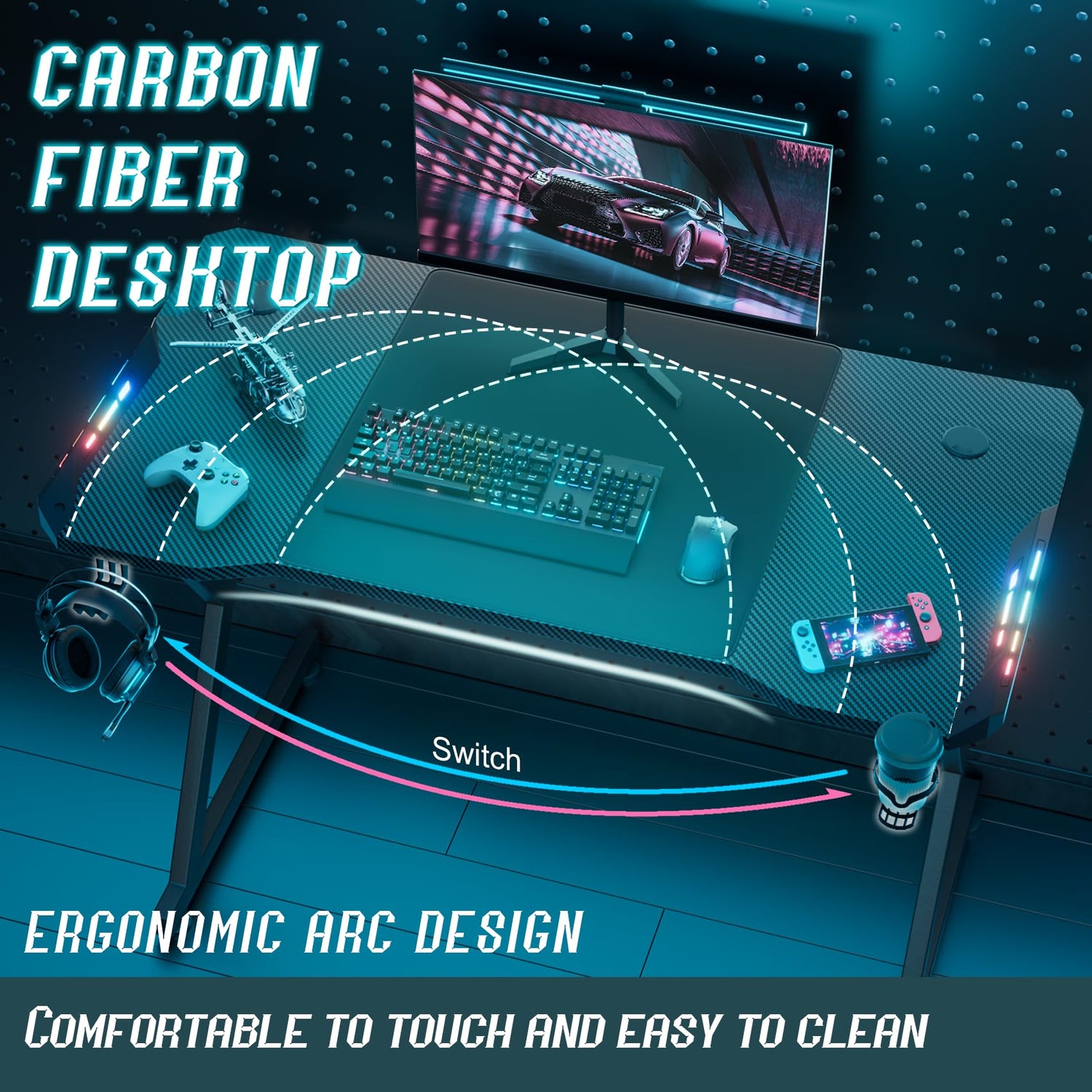 HLDIRECT 47 Inch Gaming Desk with LED Lights, Ergonomic Computer Table with Carbon Fibre Surface, Sturdy PC Workstation Desk for Home Office with Headphone Hook, Cup Holder, Black