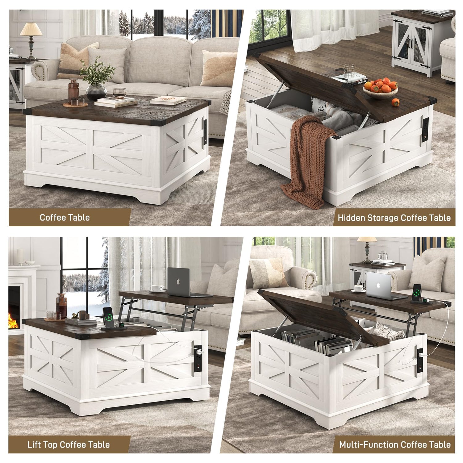 Hlivelood 36" Farmhouse Movable Lift Top Coffee Table with Storage and Power Outlets, Square Wood Living Room Tables with Wheels&Large Hidden Space, Lift Wooden Barn Door Center Table, White