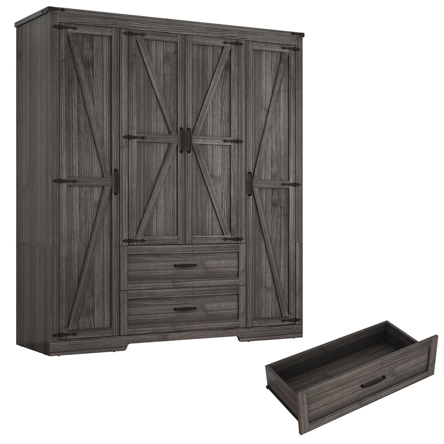 Hlivelood 4 Doors Wardrobe Armoire Closet with Doors and Drawers, Farmhouse Wooden Armoire Storage Cabinet with Shelves & Hanging Rod for Bedroom, Grey