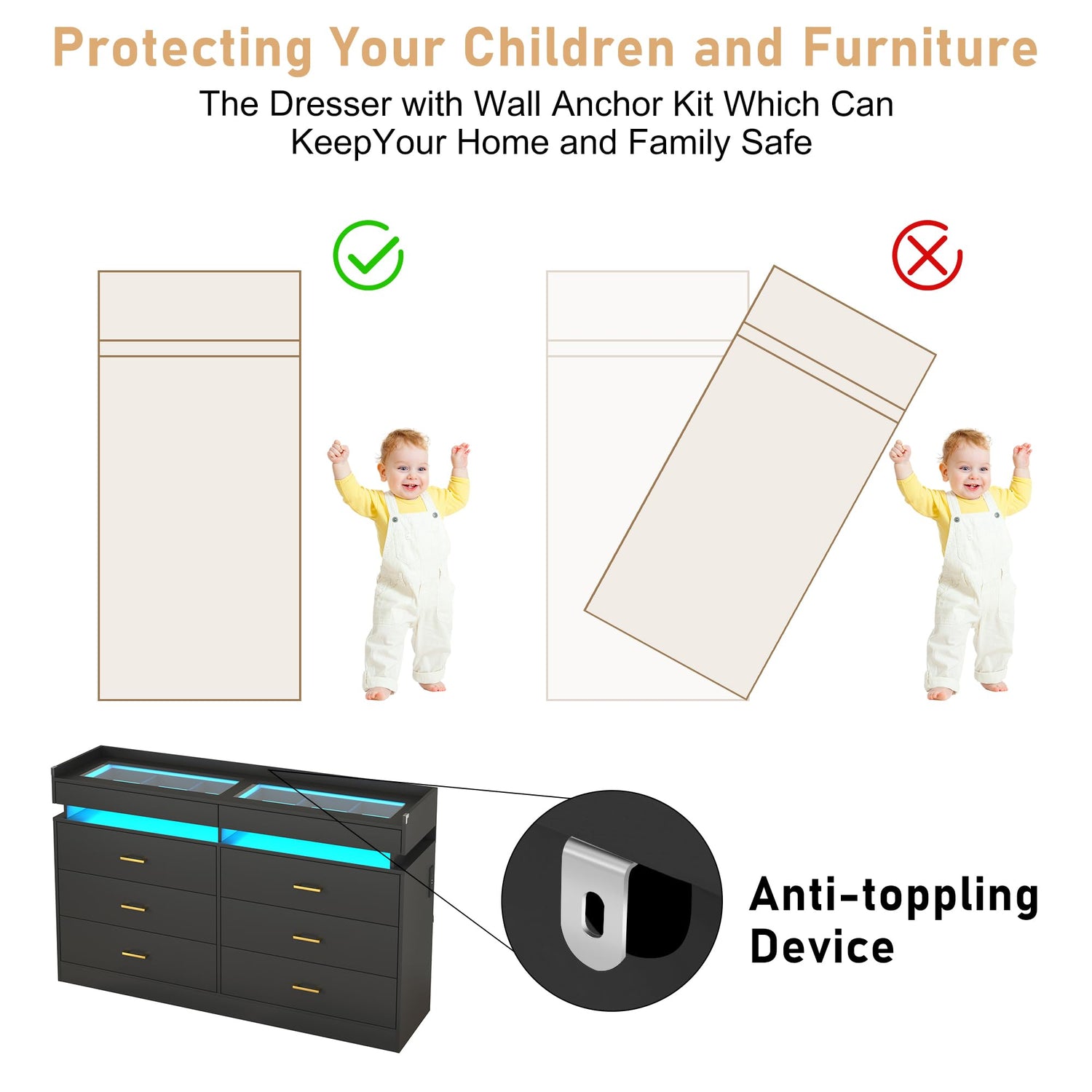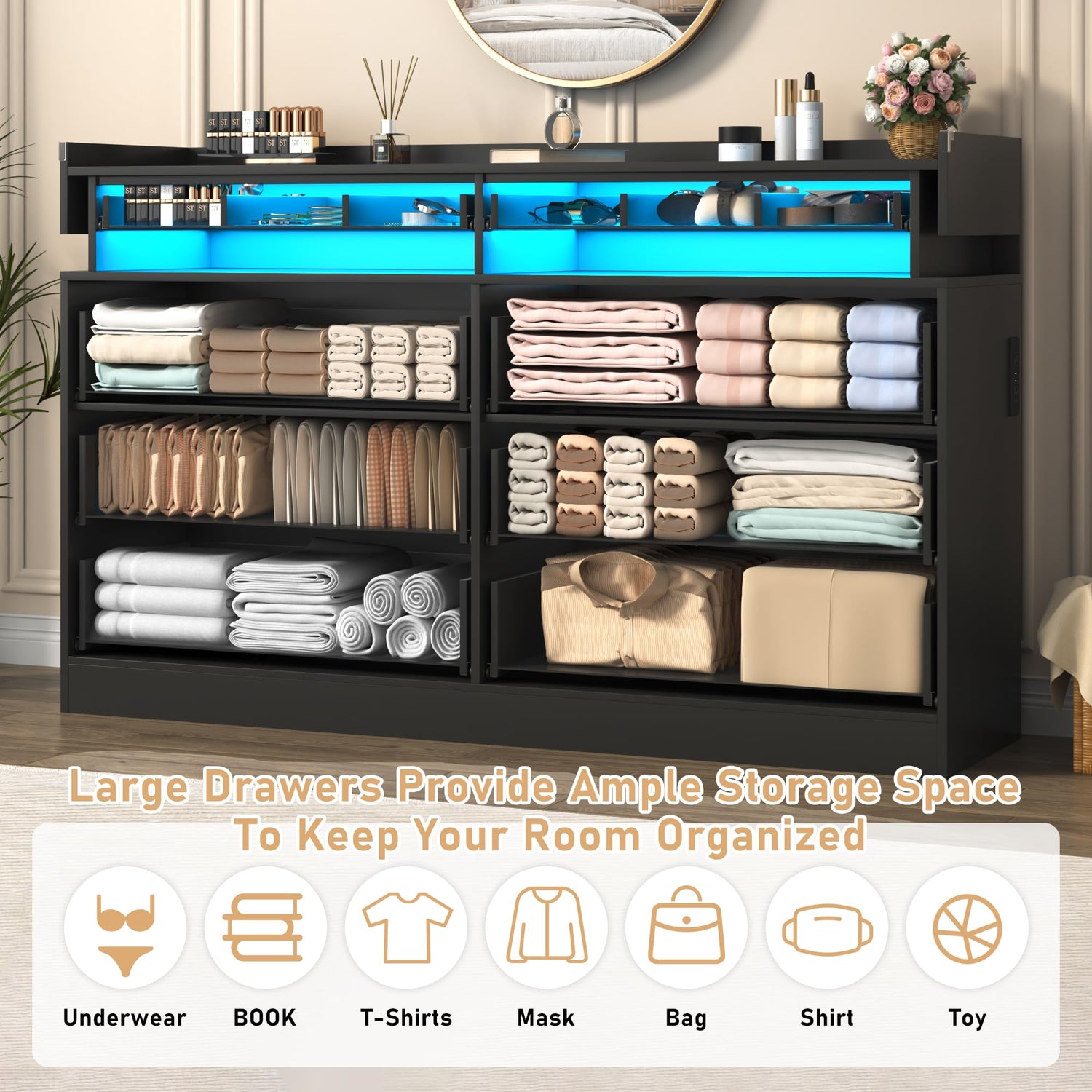 - LED Lights and Power Outlet: With a black finish and contemporary design, this 59 inch modern wooden dresser features an integrated LED light strip and built-in power outlet with a 4.92-foot power cord that makes it easy to charge your phone, headphones, watch, laptop, lamp, and other devices or power your beauty tools with ease for a modern lifestyle