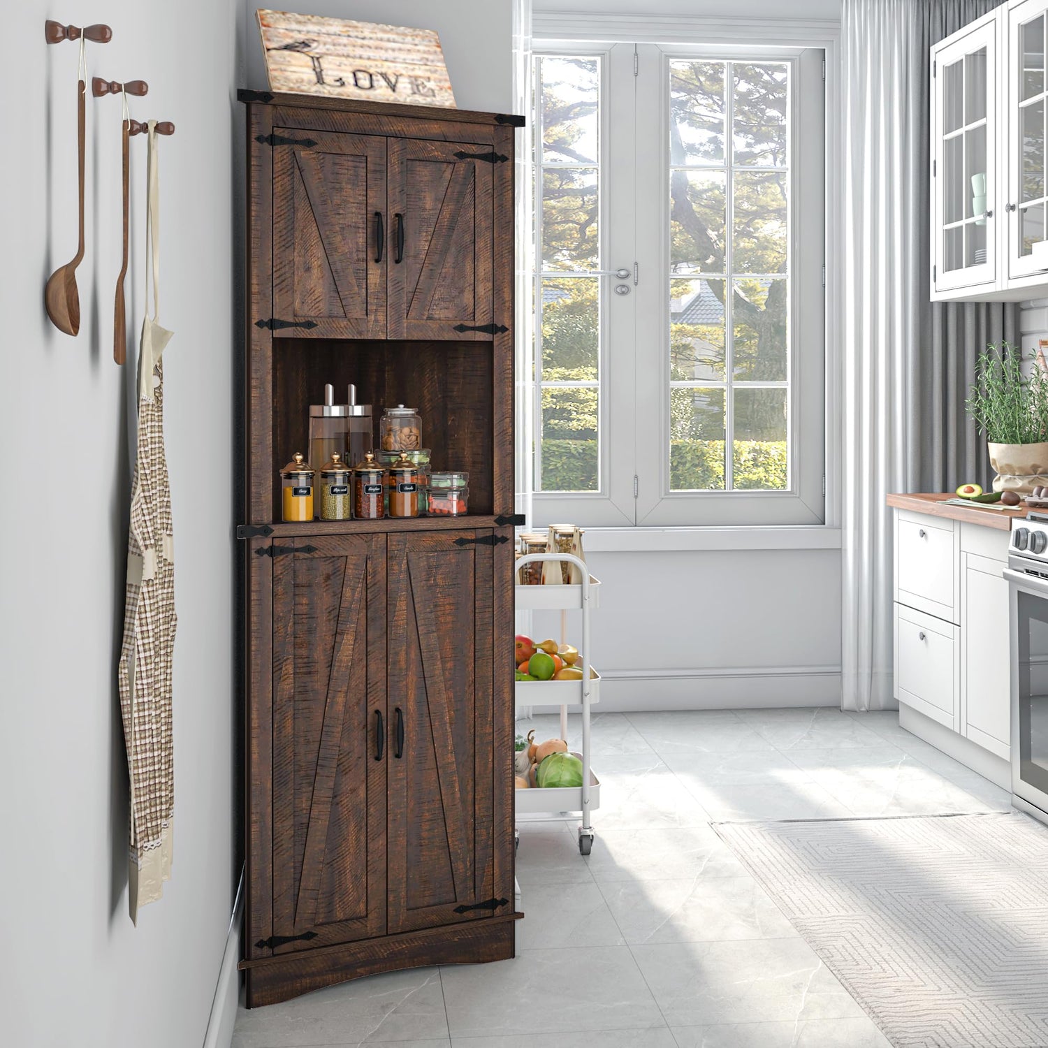 - Farmhouse Corner Cabinet: Our 68 inch farmhouse cabinet tall with storage features a unique weathered wood grain finish with metal trim. Rustic barn door style gives a great blend of charming rustic, adding a beautiful, charming touch to your living room, kitchen and bathroom. 68" tall brown farmhouse storage cabinet can fit well in any space in your home and match with different styles of scenes.
