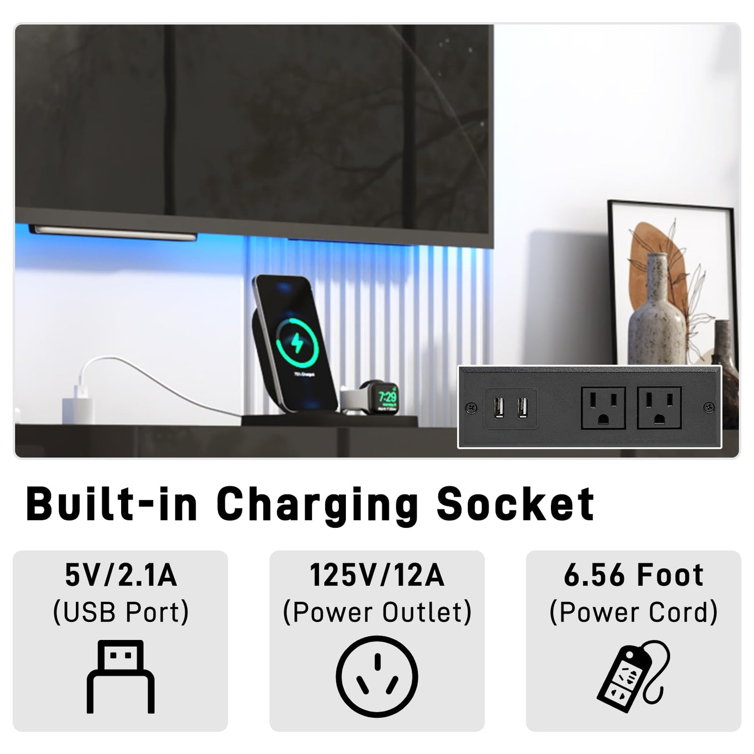 - TV Stand with Power Outlets: The top of the TV cabinet offers extra sockets: two sockets and two USB ports. This TV stand with charging station is highly functional and practical, providing sufficient power to charge all your devices quickly and efficiently in one convenient location.