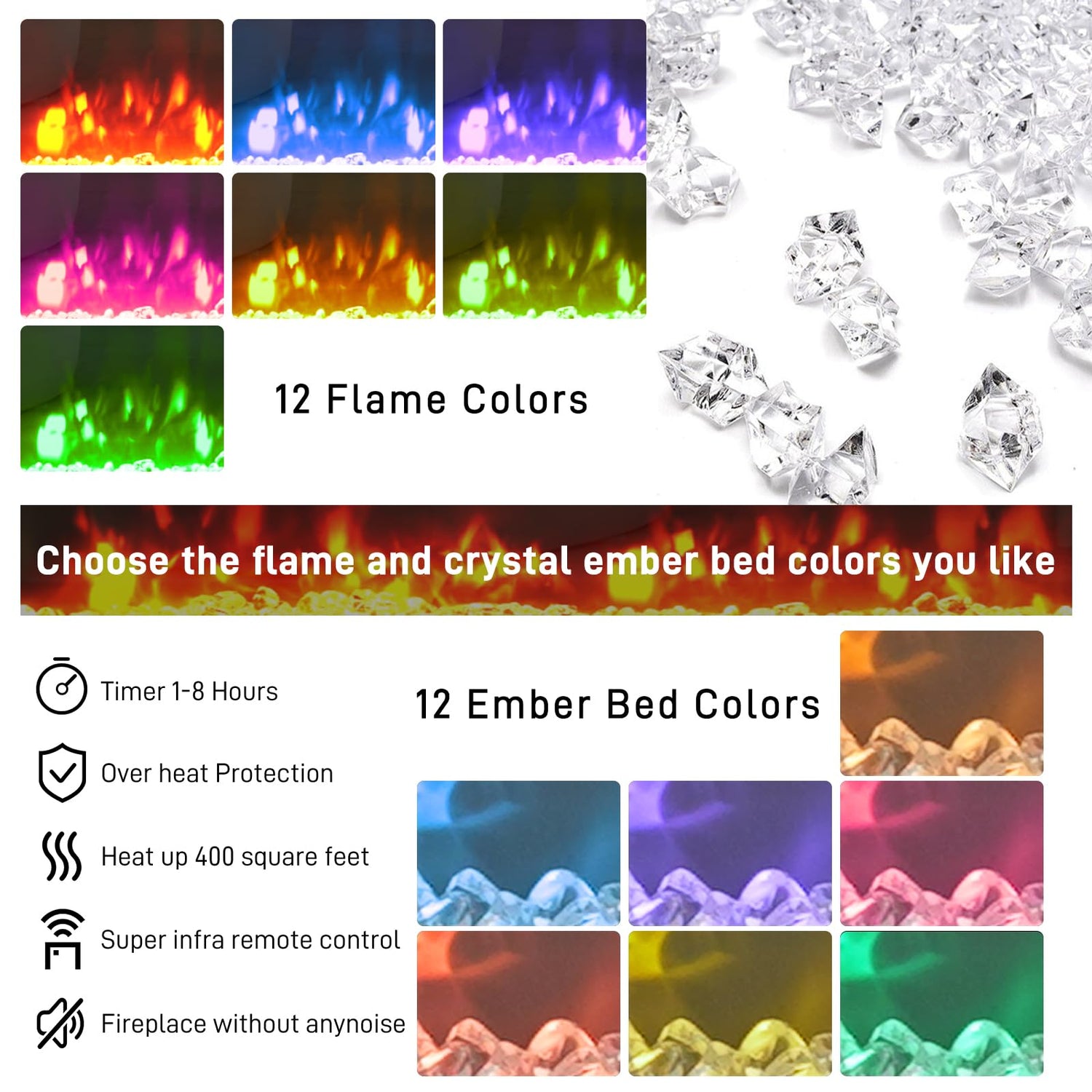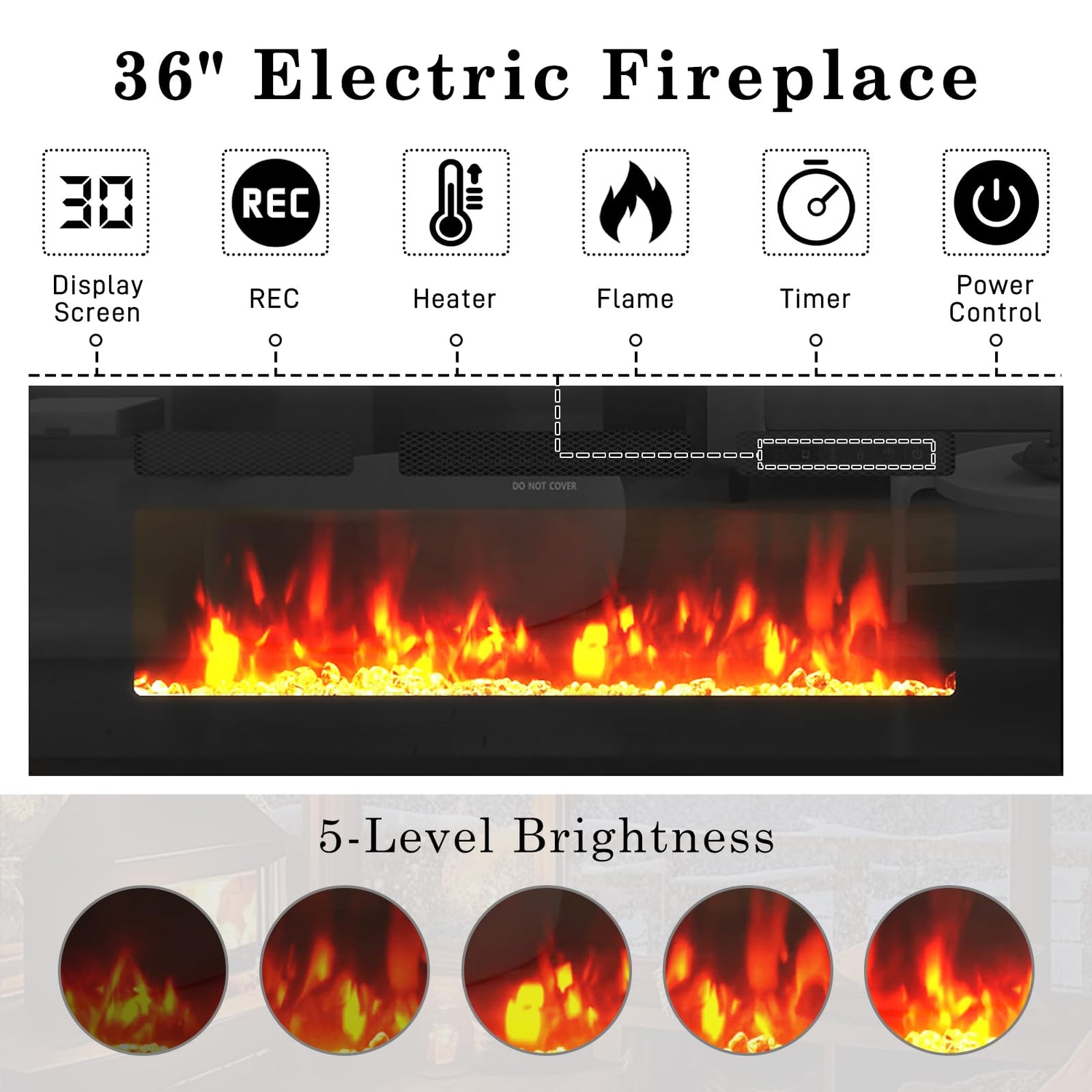 - Fireplace TV Stand with Attractive Flame: The Fireplace TV Stand features a 12 changeable 3D flame color and 12 color emberbed and 5 levels of brightness to create a cozy atmosphere. It comes with a 36 inch electric fireplace, can heat up to a 400-square-foot room. It includes a convenient timer setting function from 1 to 8 hours. The flame's color, brightness, and speed can all be adjusted for customization using the digital button or remote control.Suitable for TV size up to 80 inches