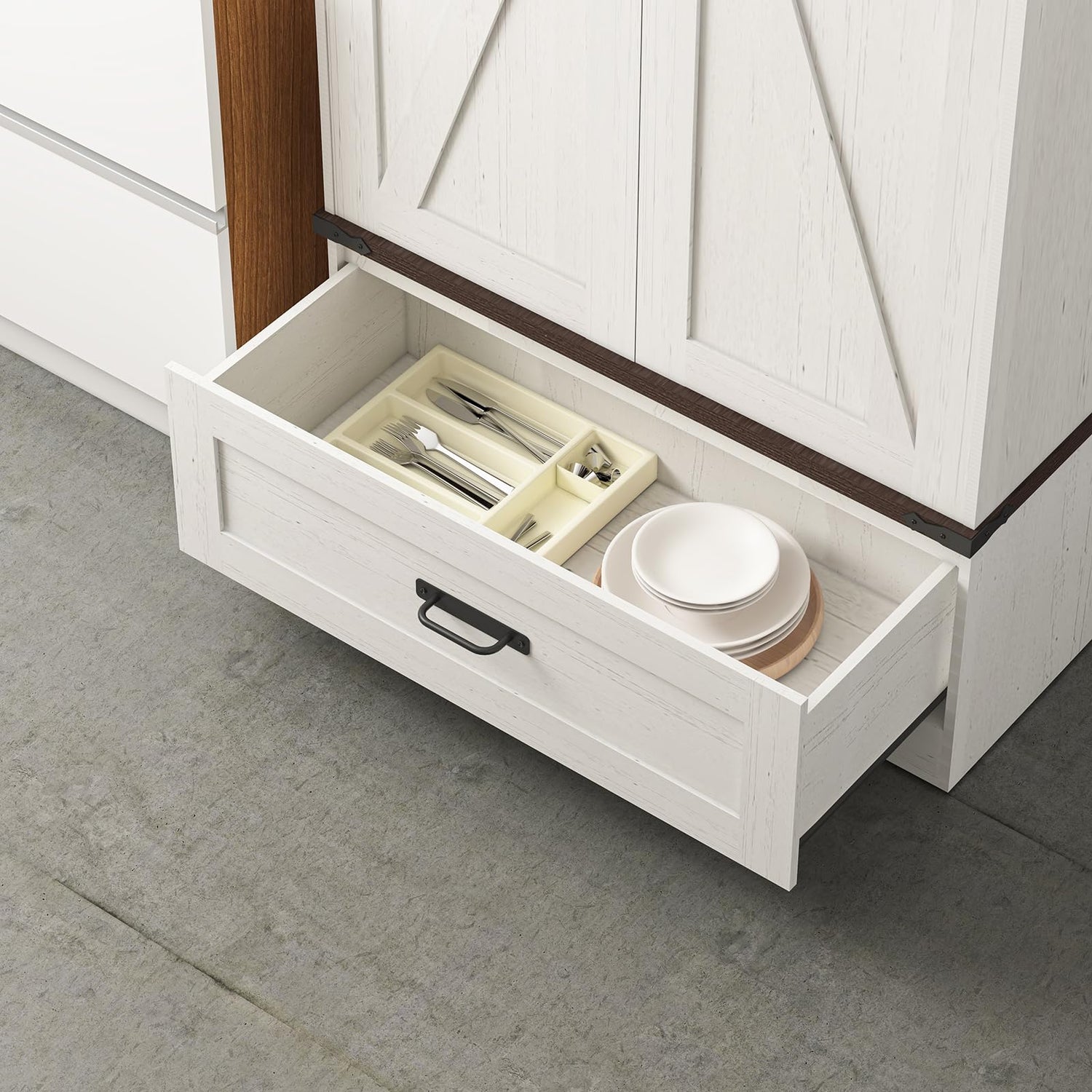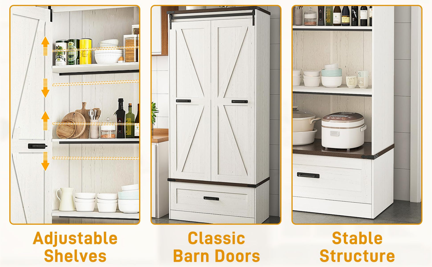Hlivelood 72" Tall Storage Cabinet with Barn Doors & Drawer, Pantry Cabinet with Adjustable Shelves, Rustic Wood Cupboard for Kitchen, Dining Room, Living Room, White