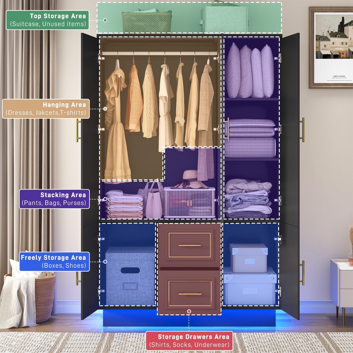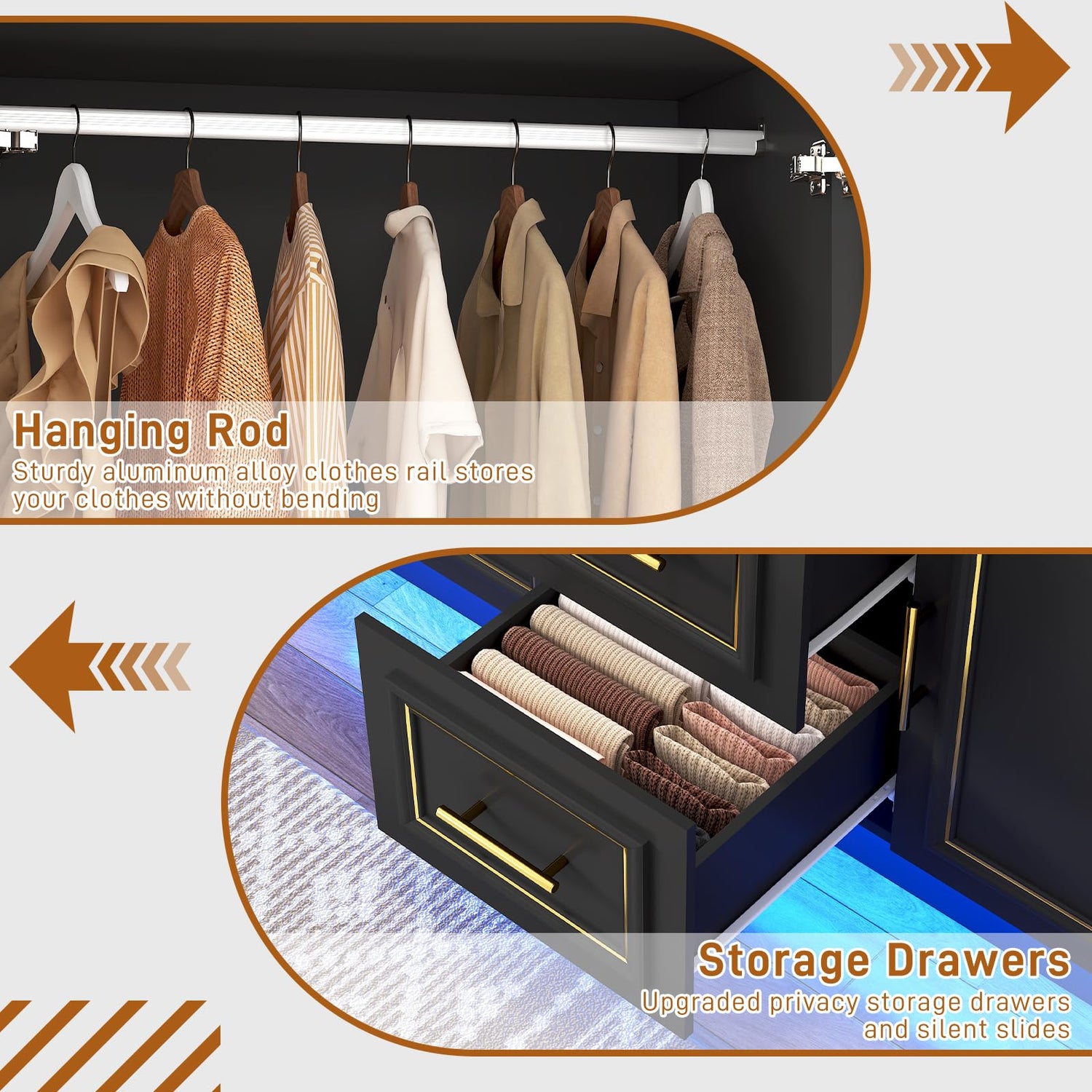 - With LED Lights: Our armoire with drawers base comes with LED lights. Select differnet colors, activate music sync, set time all from the convenience of your moblie app or remote control. Rich colors create warmth, romance, mystery, etc., adding interest to your bedroom.