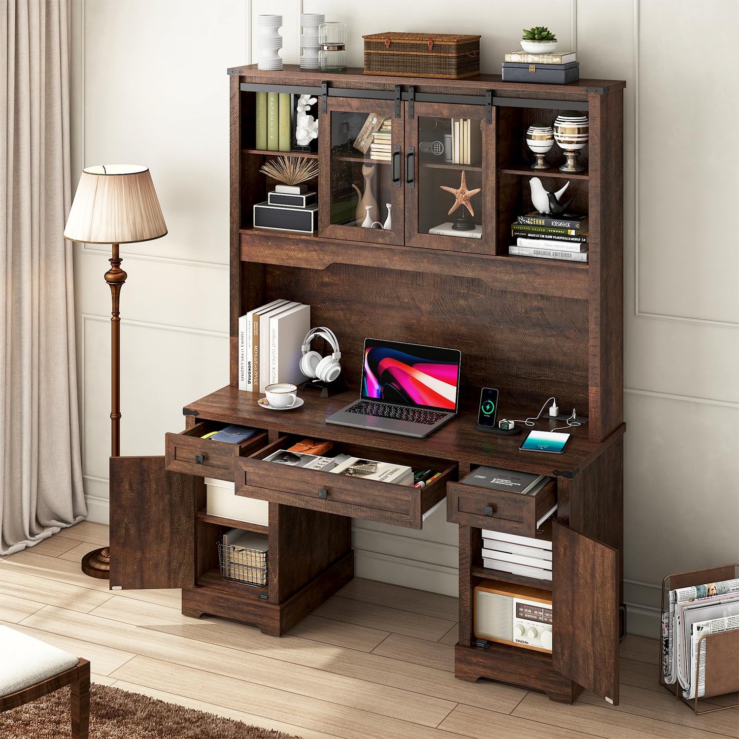 Hlivelood 76" Height Farmhouse Desk with Sliding Door Hutch, Wood Office Executive Workstation Computer Desk with Charging Station, Drawers and Storage Cabinet, for Work, Sturdy, Game, Brown