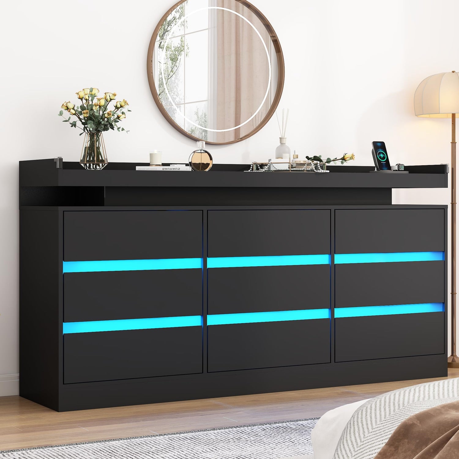 Hlivelood 9 Drawer Dresser with Power Outlet & LED Light, Modern Chest of Drawers for Closet Modern Large Dresser Organizer Cabinet for Bedroom, Living Room, Black
