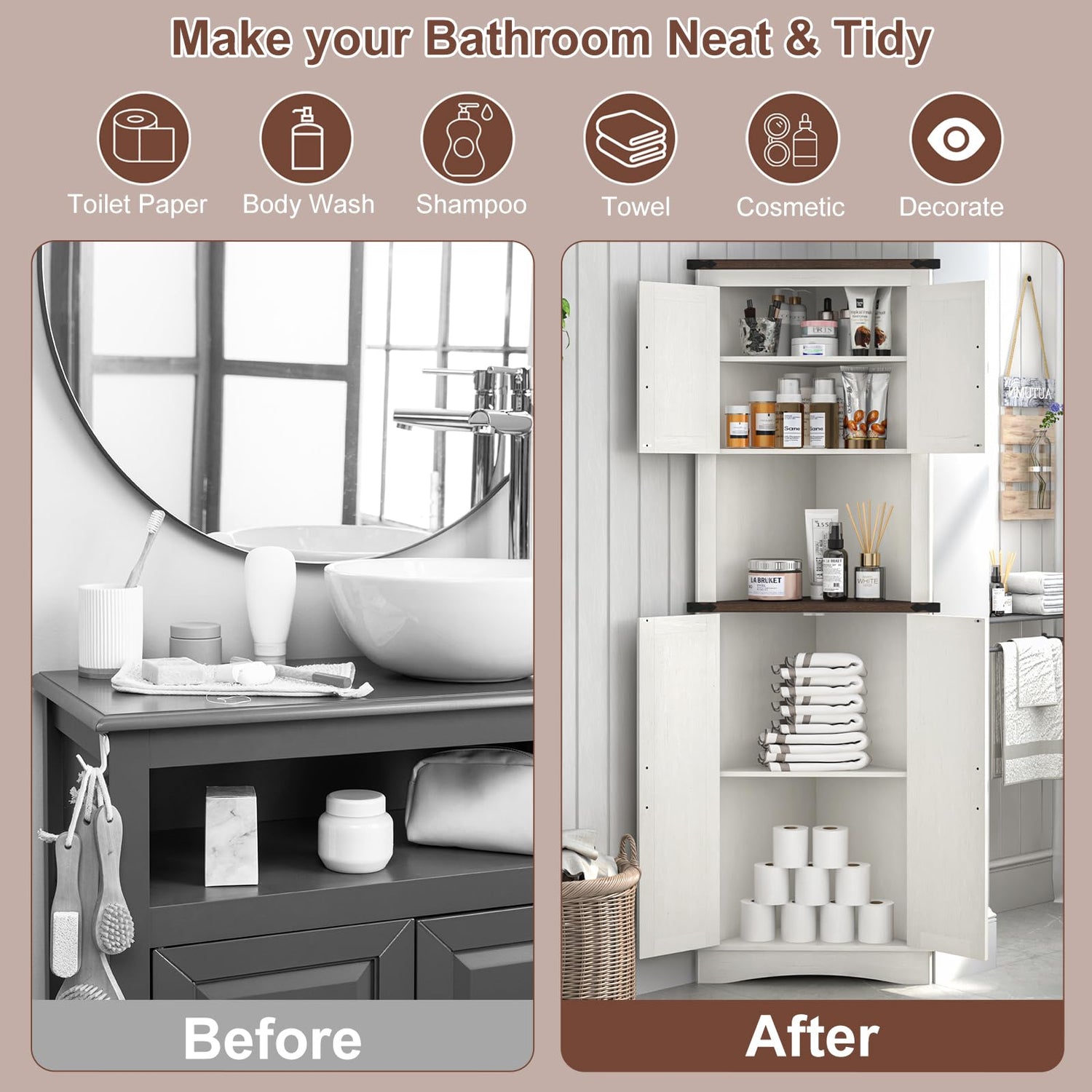- 🛁🧻 Easy to Assemble: The tall storage cabinet with doors package includes step-by-step instructions and all the hardware, and all parts and accessories are labeled. With an easy-to-follow instructions manual and only taking 30 minutes to assemble you can get a beautiful farmhouse bathroom corner storage cabinet/kitchen cabinet/living room tall corner cabinet!