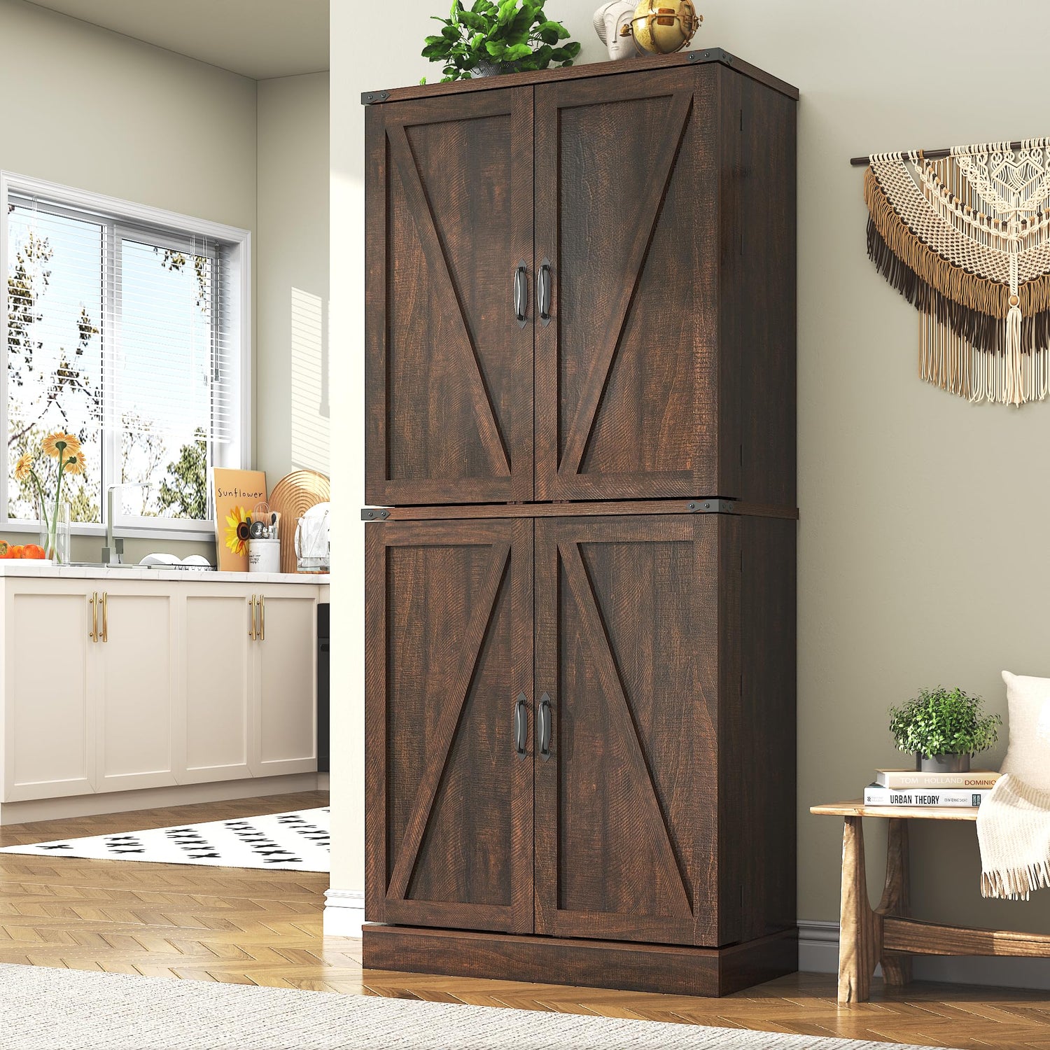 Hlivelood Farmhouse Kitchen Pantry Cabinet, 71" Tall Storage Cabinet with Adjustable Shelves & 4 Barn Doors & Drawer, Rustic Wood Cupboard for Kitchen, Dining Room, Living Room, Brown