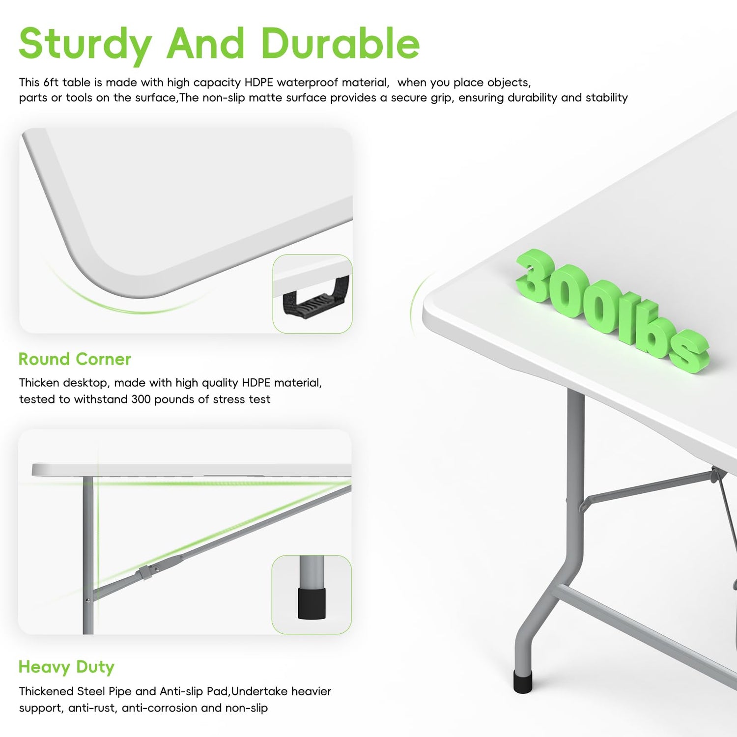 - High-Quality & Sturdy: Constructed with premium HDPE material and reinforced steel legs, our 6 ft folding table can hold up to 300 pounds, ensuring long-lasting stability and durability