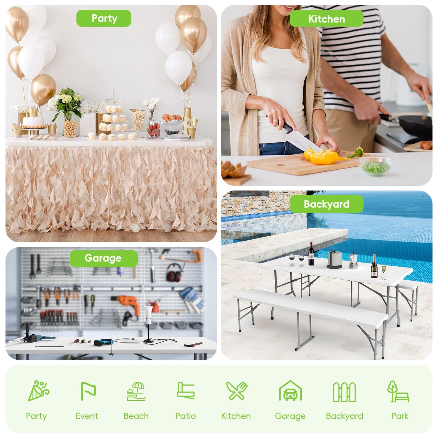 - Versatile & Practical: Whether you're hosting a party or looking for a workspace solution, this versatile folding table is perfect for use in a variety of indoor and outdoor settings, including patios, gardens, poolside areas, lawns, and more