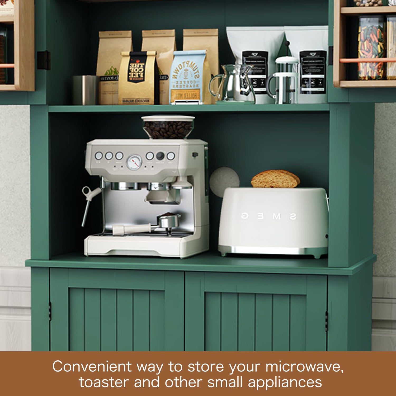 - 【Features】Our Kitchen pantry cabinet features with two double-door cabinets and one large center hutch which can provide spacious space to store your home small appliances. Every area is utilized here, with the wooden racks on the doors offering space for small tins and jars.