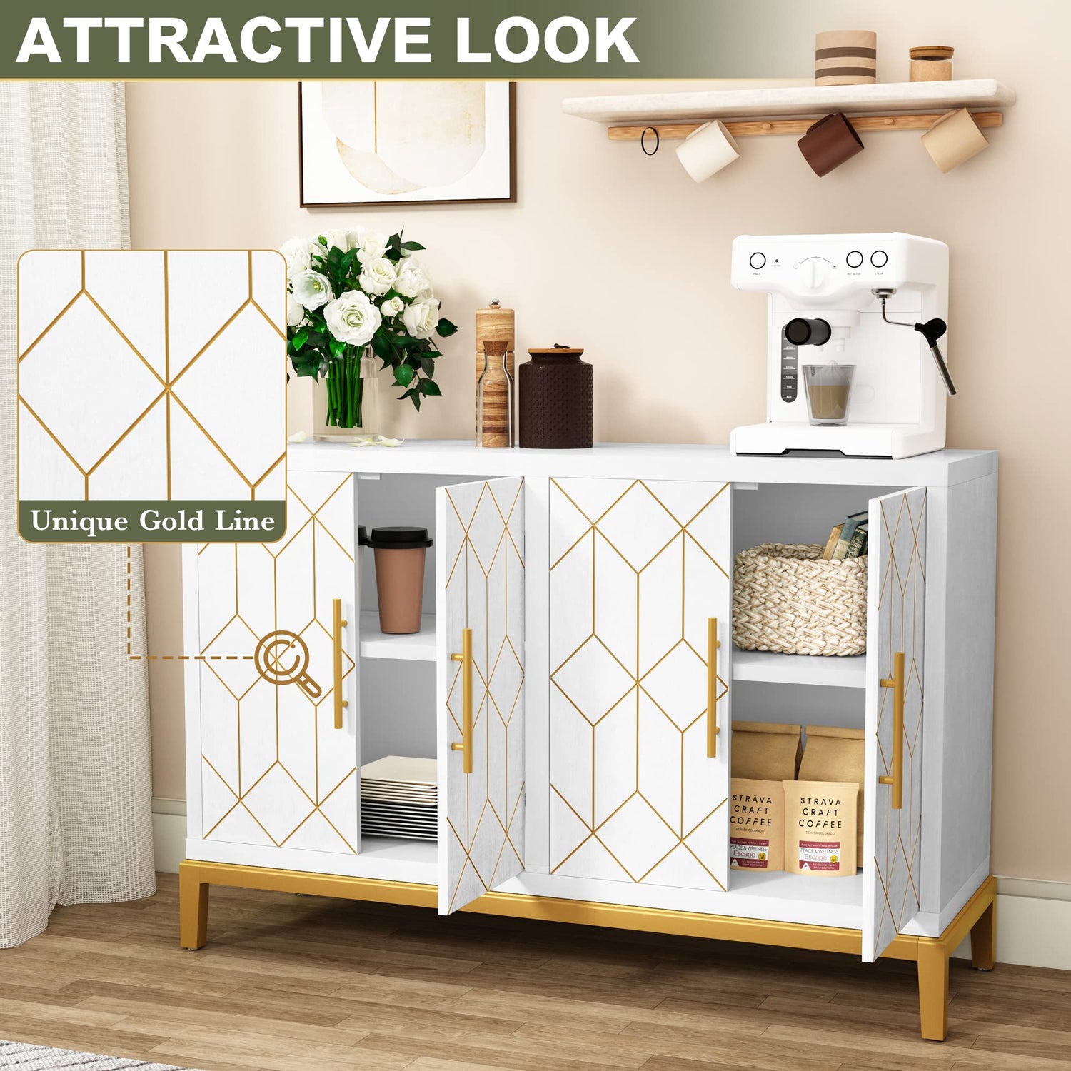 HLR Accent Cabinet with 4 Doors and Shelves, Sideboard Buffet Cabinet with Gold Lines, Modern Credenza Storage Decorative Cabinet for Living Room, Entryway, Kitchen, Dining Room, White