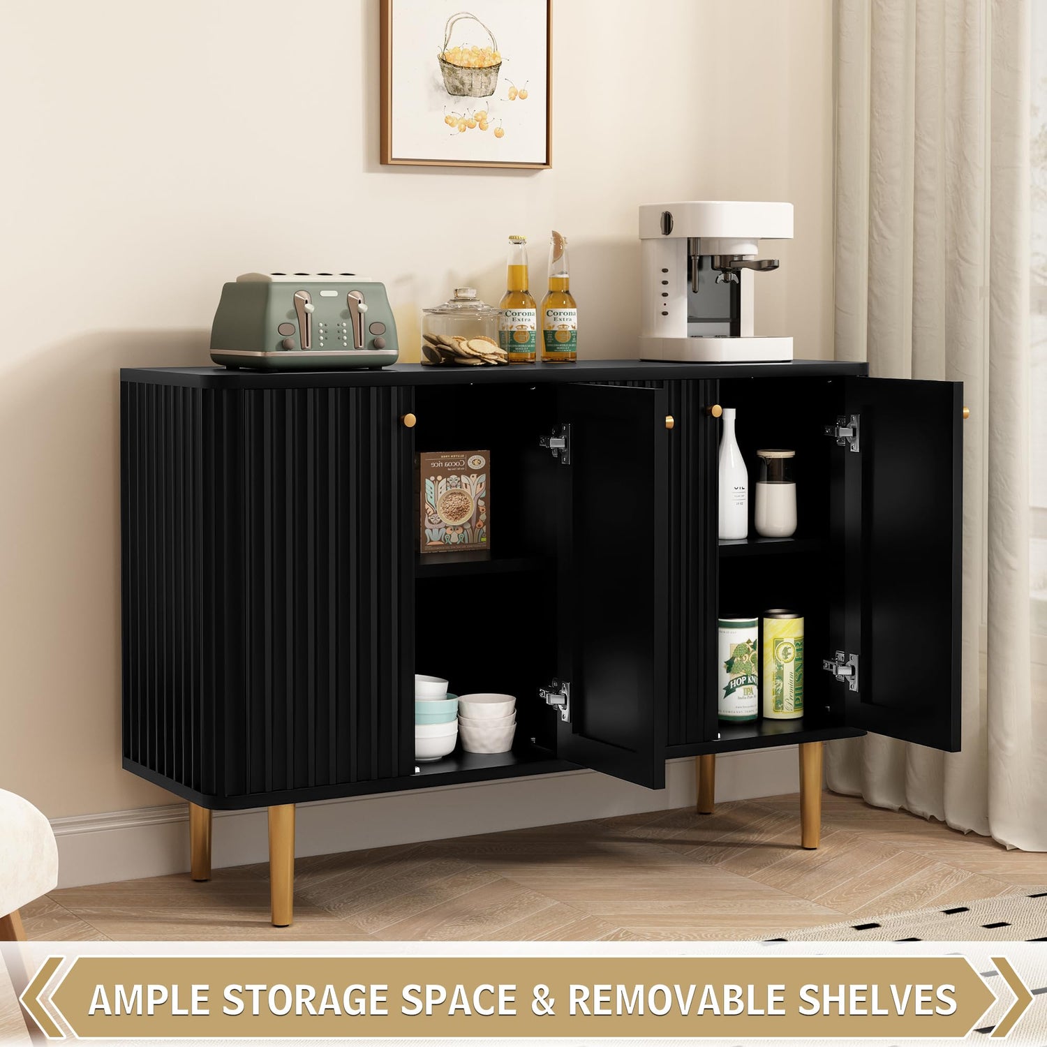 HLR Sideboard Buffet Cabinet, 48" Modern Accent Cabinet with 4 Door and Removable Shelves, Credenza Entryway Cabinet with Storage for Living Room, Dinning Room (Black)