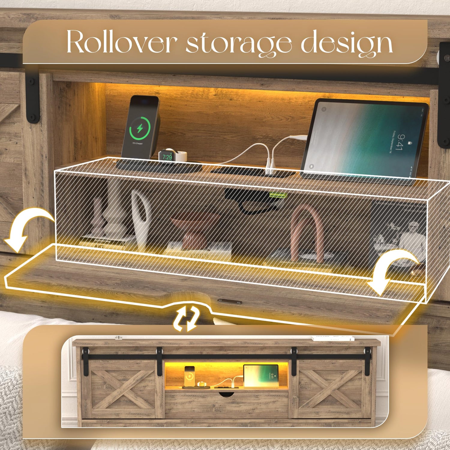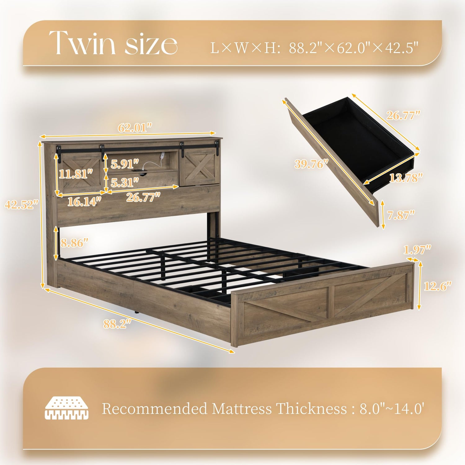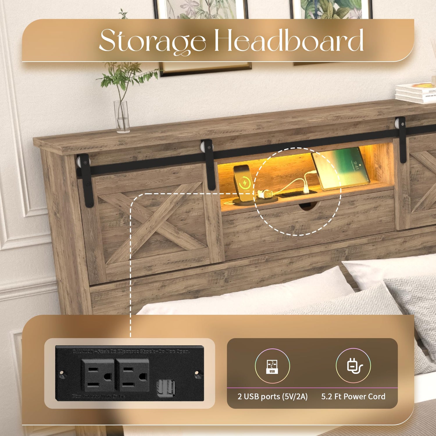 - π STORAGE HEADBOARD WITH SLIDING BARN DOOR - The headboard of the bed frame features abundant and varied storage space, The Spacious top of the headboard, 2 storage compartments hidden behind sliding doors, a shelf, and a storage box with door. The perfect combination of rustic aesthetics with abundant storage.