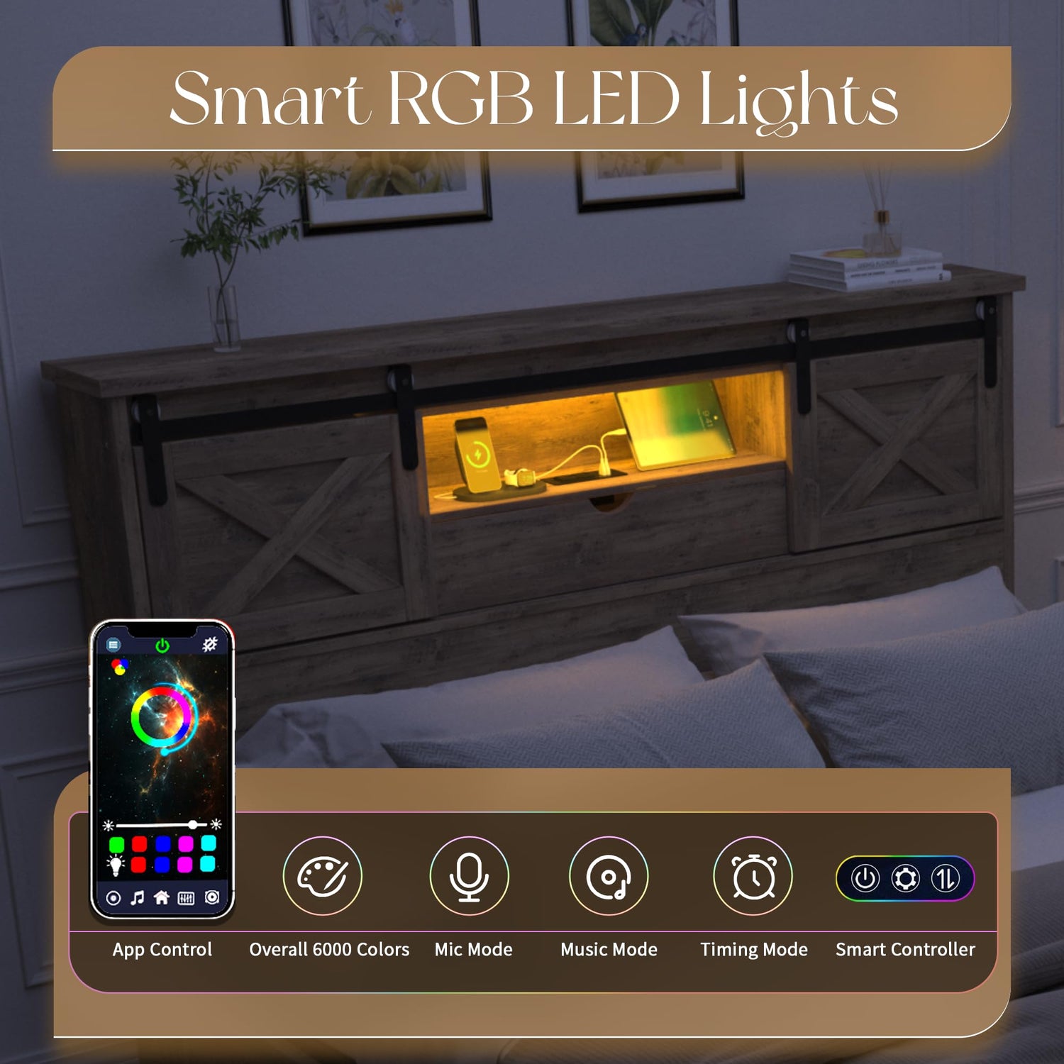 - π BUILT-IN CHARGING STATION AND LED LIGHTS - The queen bed frame is equipped with hidden light strips in the headboard storage shelf. The AC power supply (2 AC outlets + 2 USB ports) is located on the center shelf of the headboard, perfect for charging your phone, tablet, or headphones while entertaining in bed without having to get up.