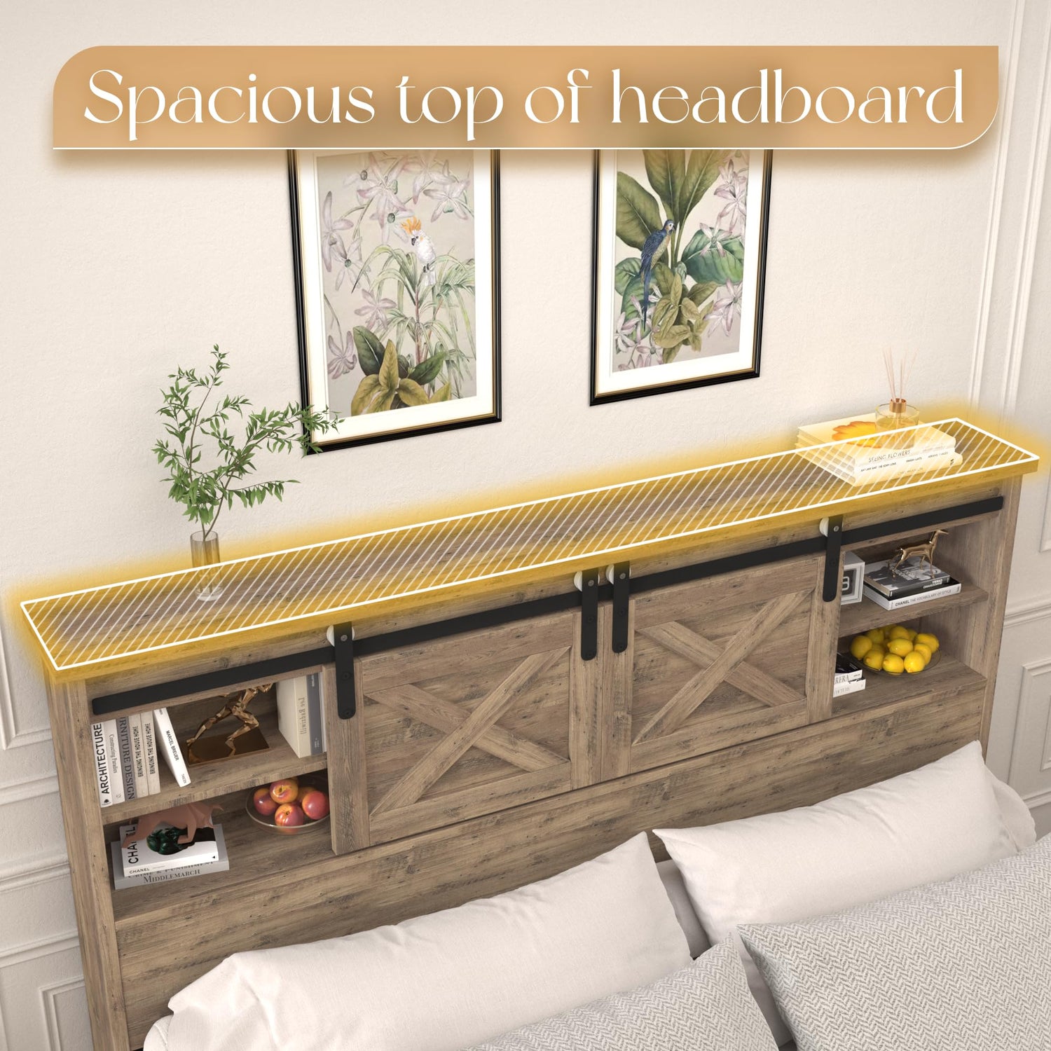 - π FARMHOUSE AESTHETIC - The barn doors of the bed frame set an aesthetic akin to traditional, while antique metal accents lend a hint of modernism to the bed frame. Blending farmhouse beauty and practicality of headboard storage, Introduce personality to your bedroom style.