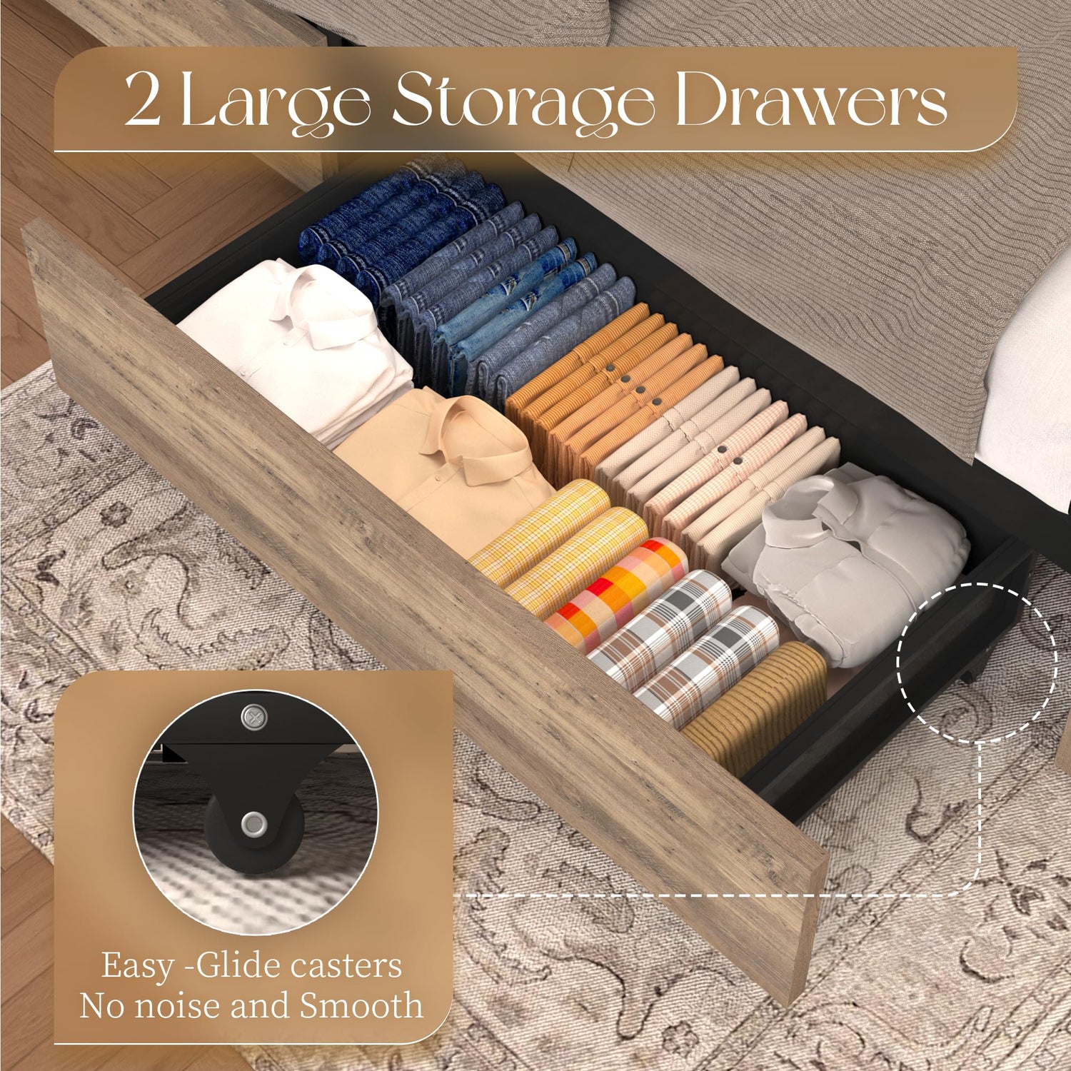 - π 2 UNDER BED DRAWERS - Equipped with 2 large-capacity storage drawers under the bed frame. each with smooth wheels that can be easily pulled out and closed, making it easy to store all kinds of bed linen, clothes, etc.