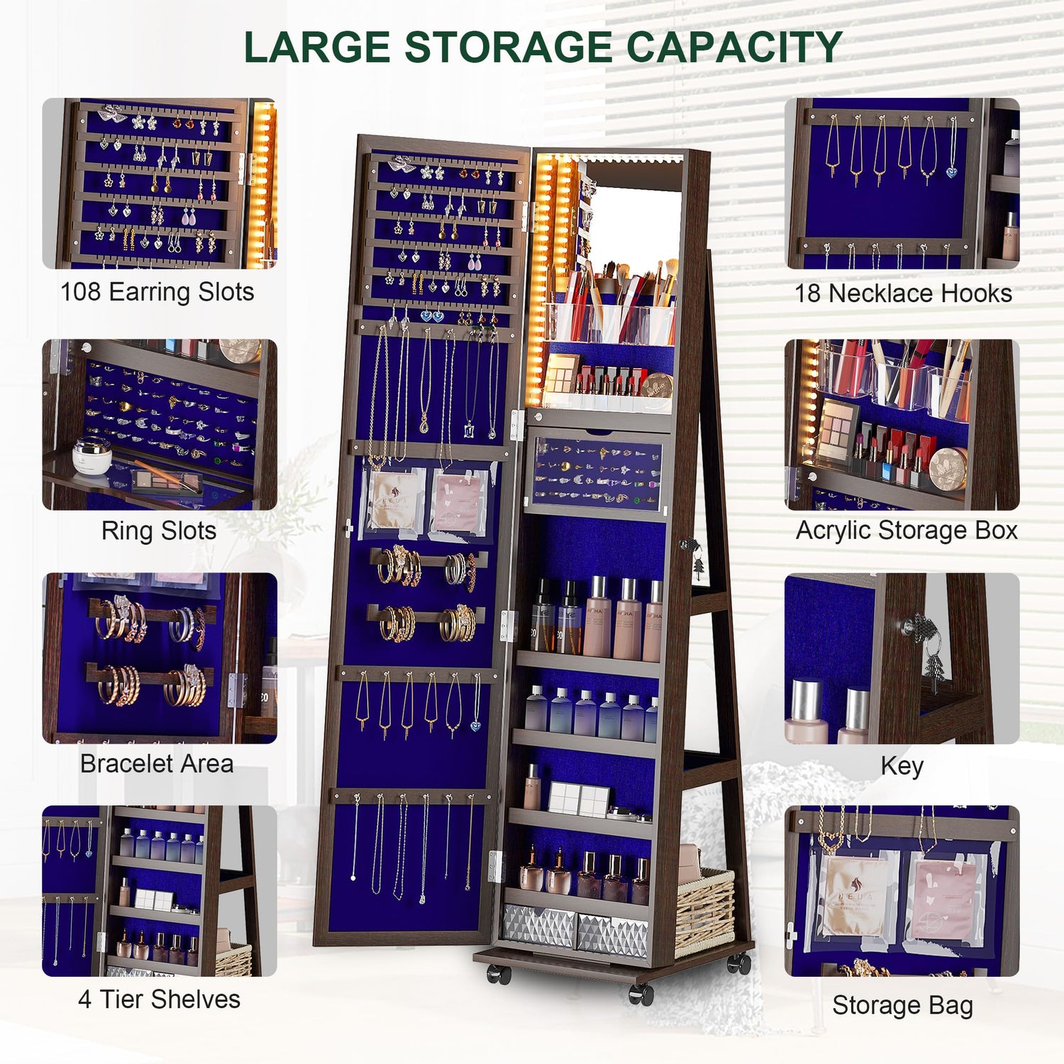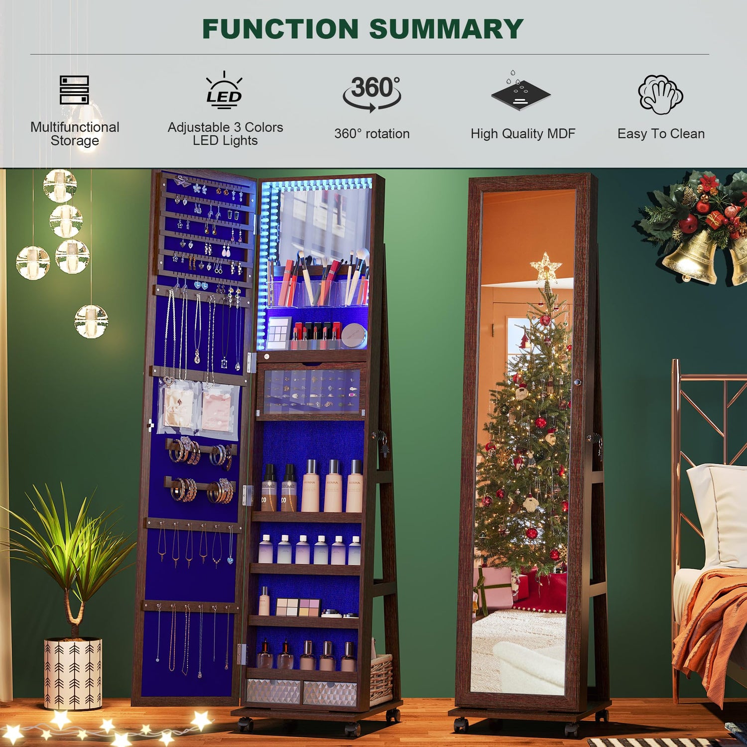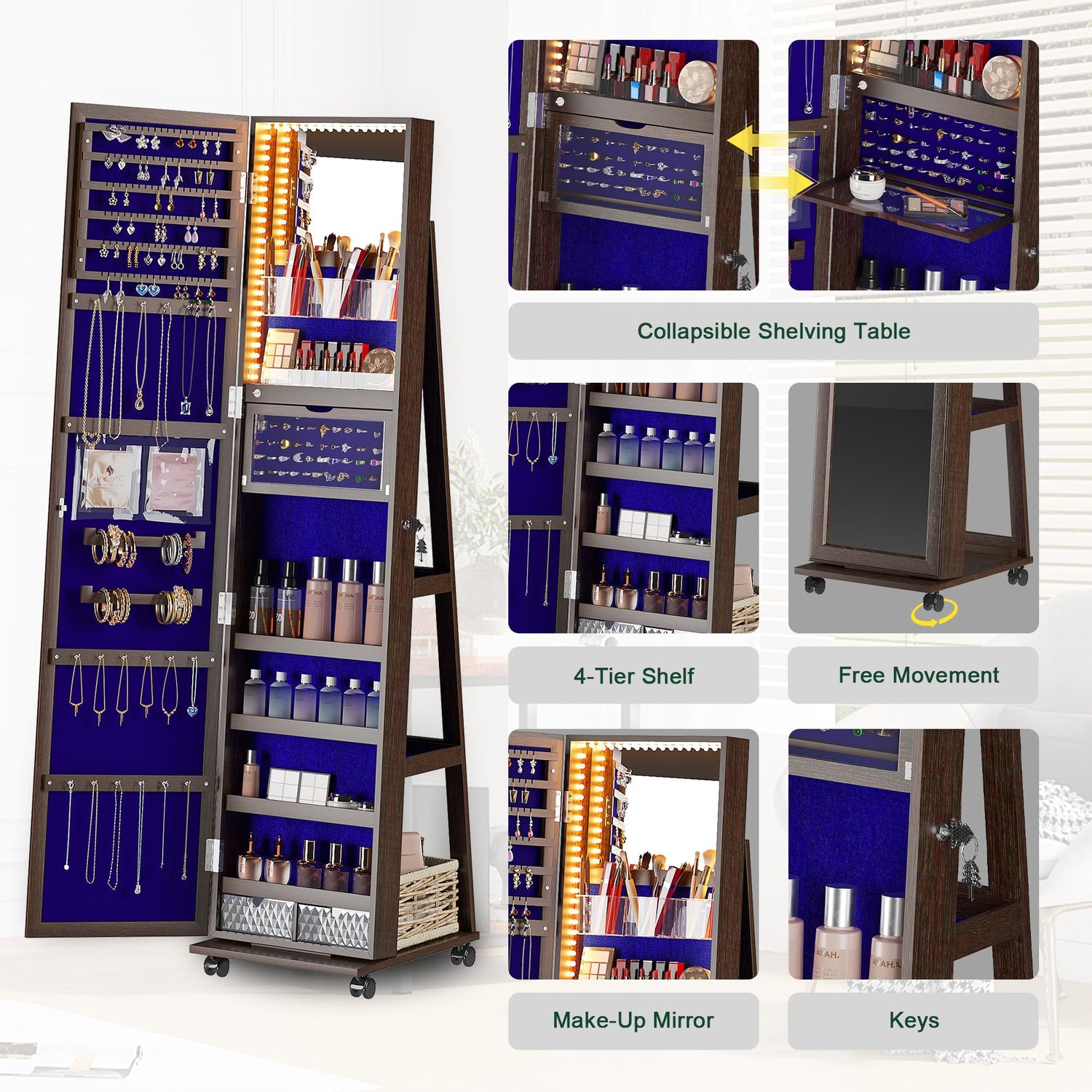 HNEBC 360° Rotating Jewelry Armoire with Lights, Lockable Mirror Jewelry Cabinet, Standing Full Length Mirror with Jewelry Storage, Large Jewelry Mirror Organizer, Wheels,Foldable Makeup Shelf (Brown)