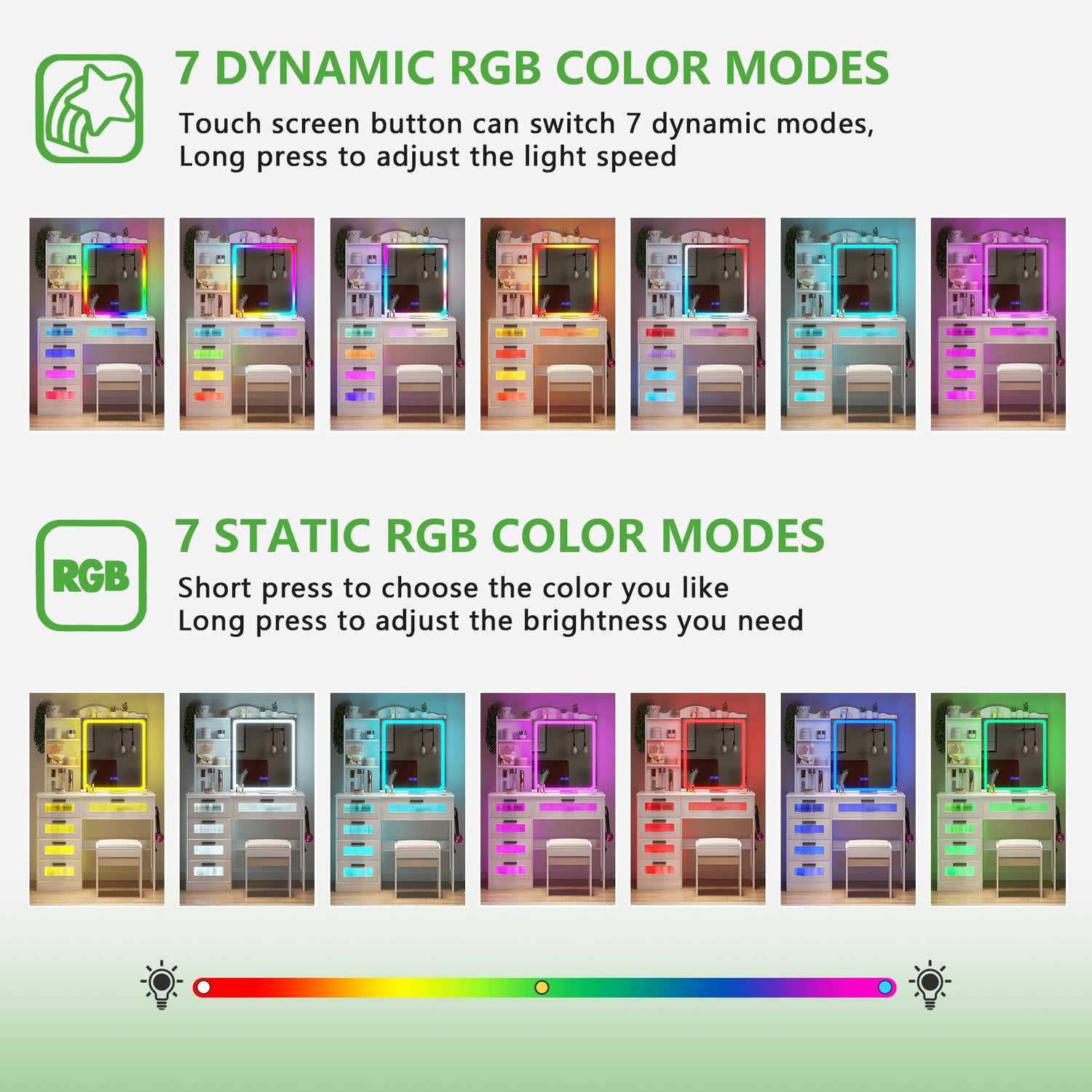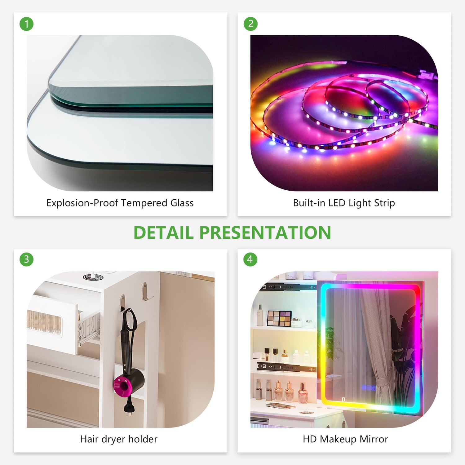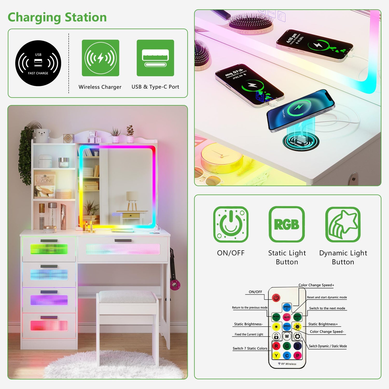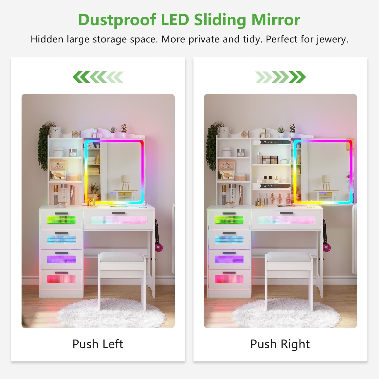 HNEBC Vanity Desk with Sliding Mirror and LED Lights, RGB Vanitys with Charging Station, Makeup Vanity with Remote Control, White Dresser with Stool/Lager Drawers for Bedroom (White)