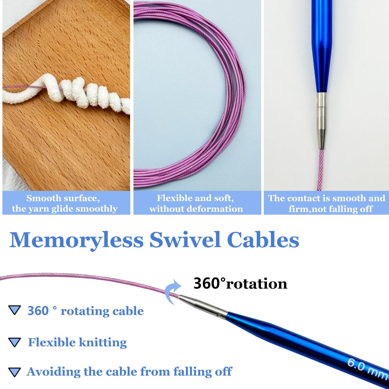 - 【4 Memoryless Swivel Cables】 There are 4 sizes cable.The memoryless swivel cables surface is smooth,the yarn can glide smoothly;High flexibility,without deformation.If you think they are not long enough,you can connect cables with connectors to make them the length you want.Our needles and cord are tightly connected in a spiral manner,then tighten it with retaining key to keep the joint firm and smooth.No need to worry about the cable falling off from the connection