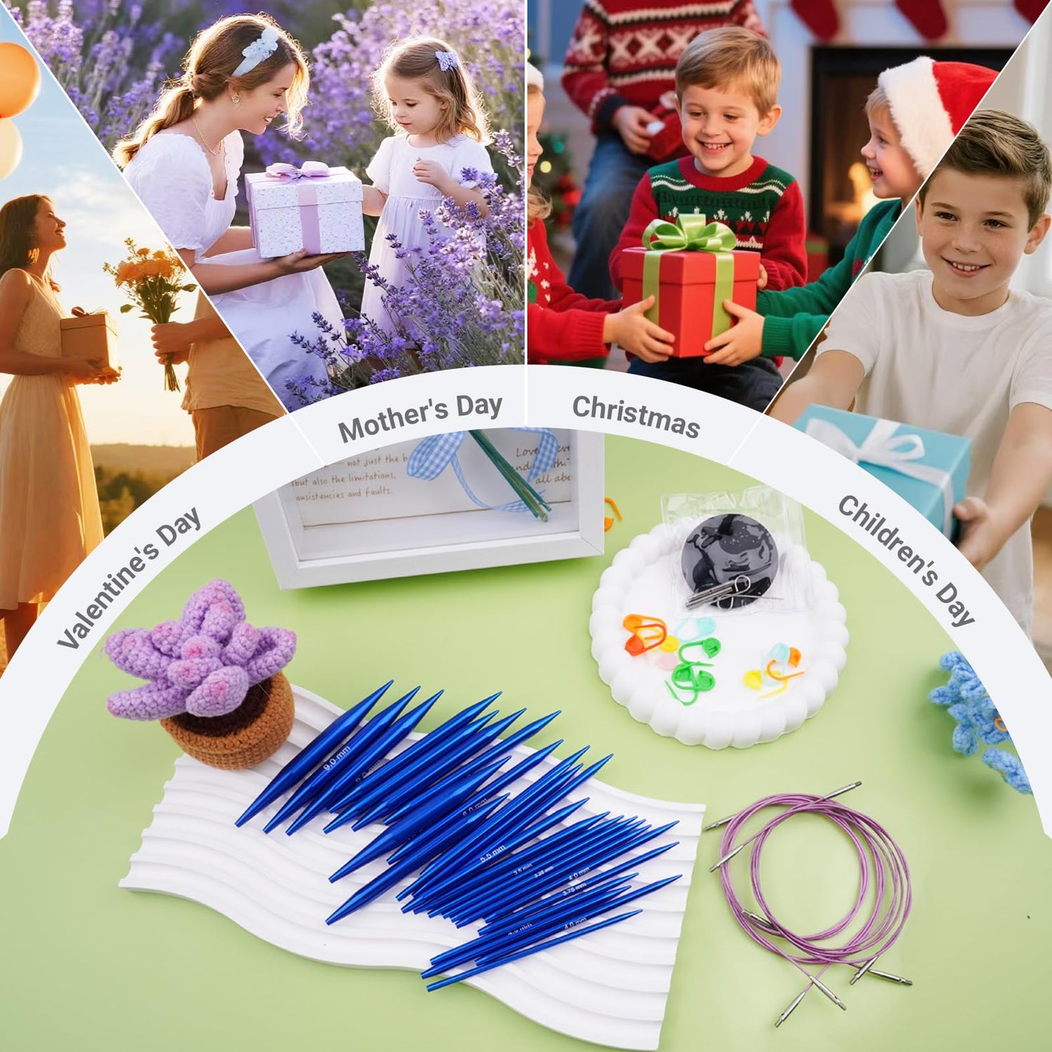 - 【Perfect Gift】 Comes with a blue compact storage bag,which can hold aluminum knitting needles and accessories inside.This flawless set can as a gift to your mom,grandmother,lover and other people who love knitting on Christmas,Mother's Day or Valentine's Day.When they use this comfortable,smooth and beautiful Interchangeable knitting needles with cable,their knitting process will be very smooth.Round knitting needles set are very practical,it as a gift to convey warmth is a good choice