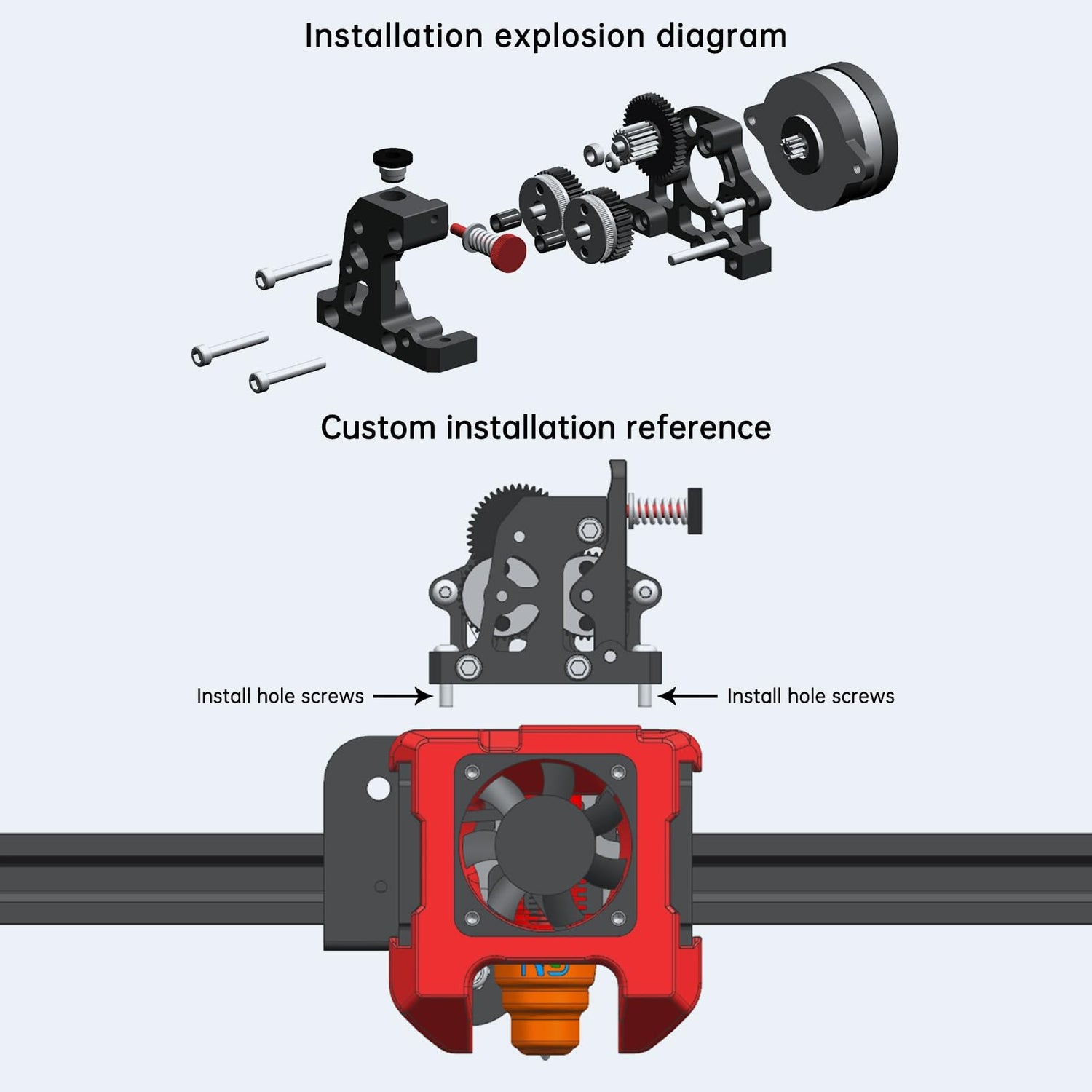 Details: Note: Do not tighten the screws to the end when there are no filament installed, otherwise the aluminum parts will get stuck! And In daily printing, it is recommended to add grease to the gear basket bearing regularly.
